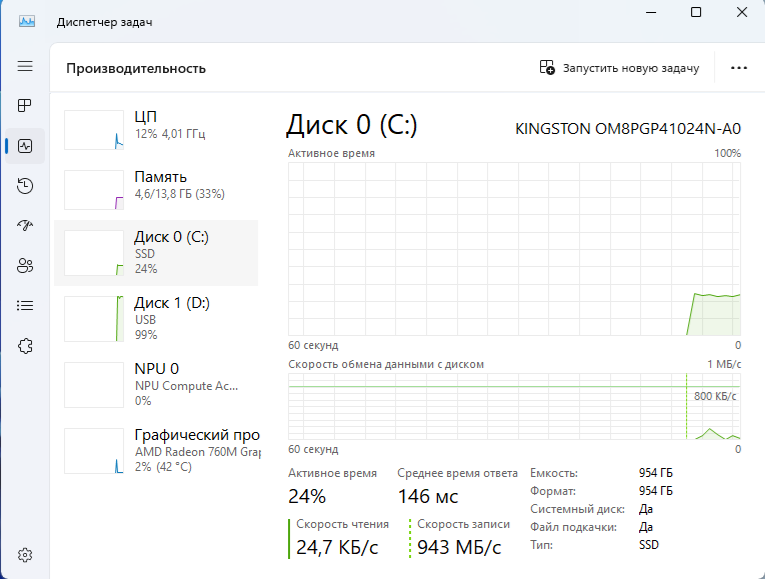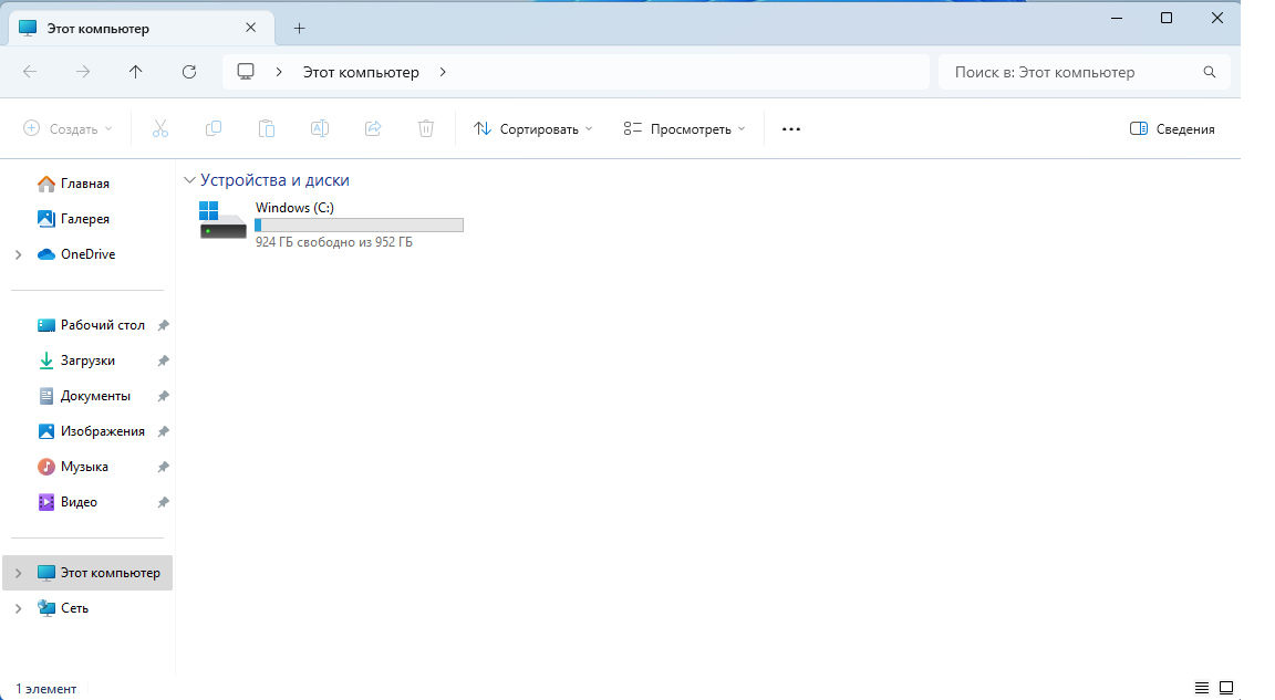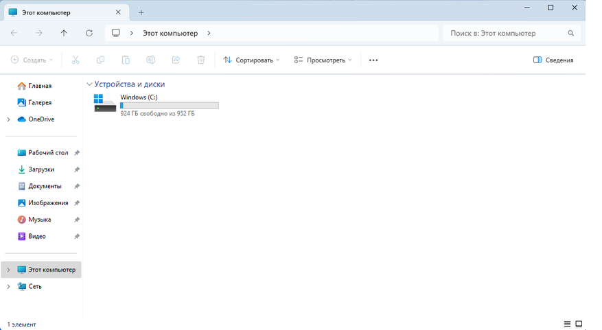 Компьютер поставляется с предустановленной ОС Windows 11 Pro, её я и использовал для тестирования. Изначально, на SSD было свободно 924ГБ.