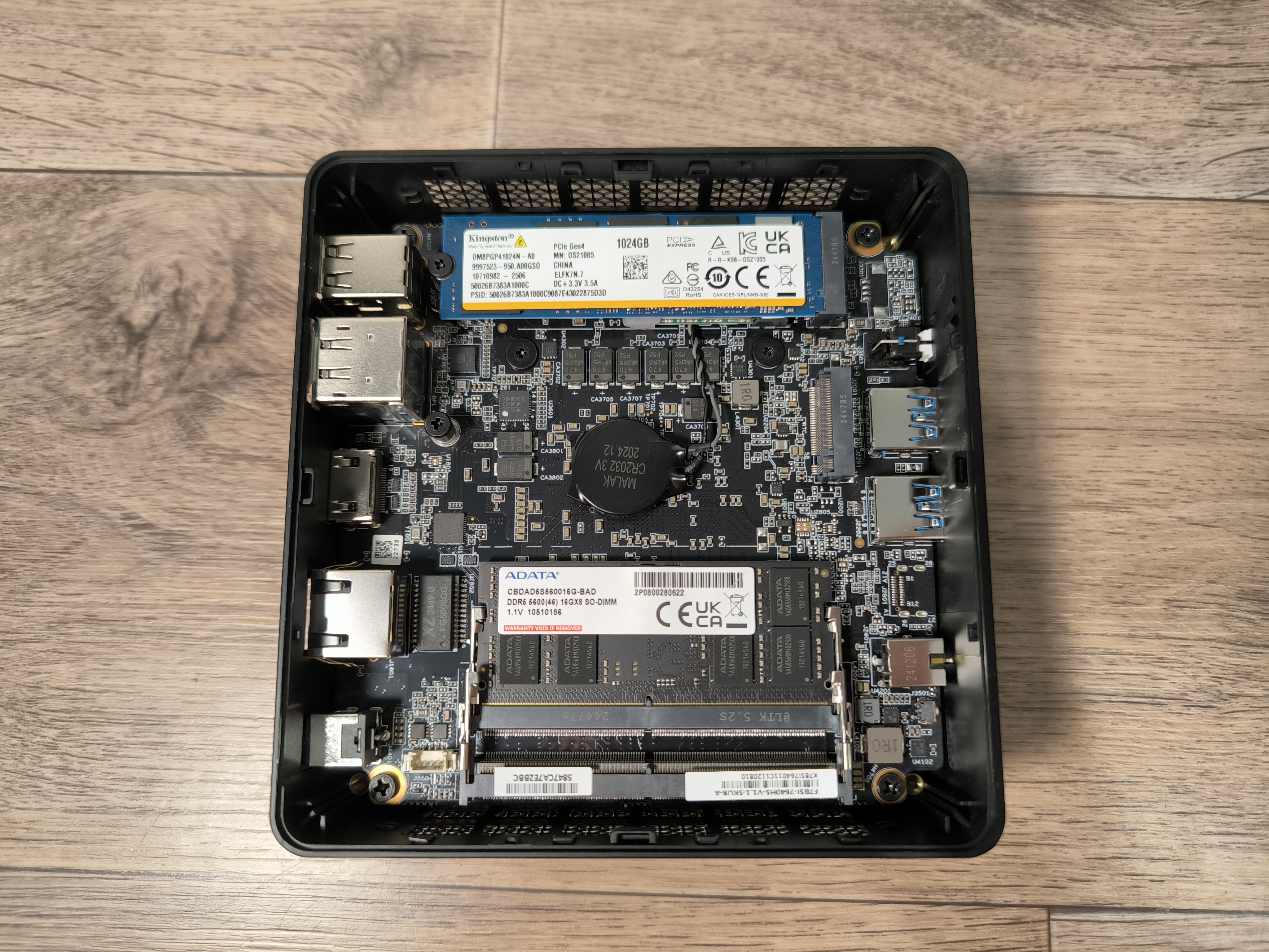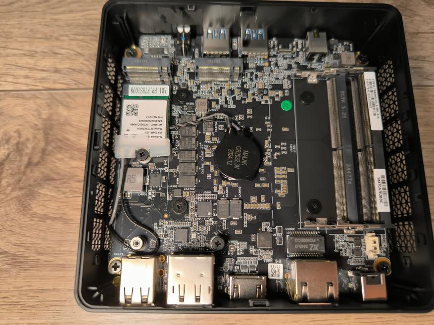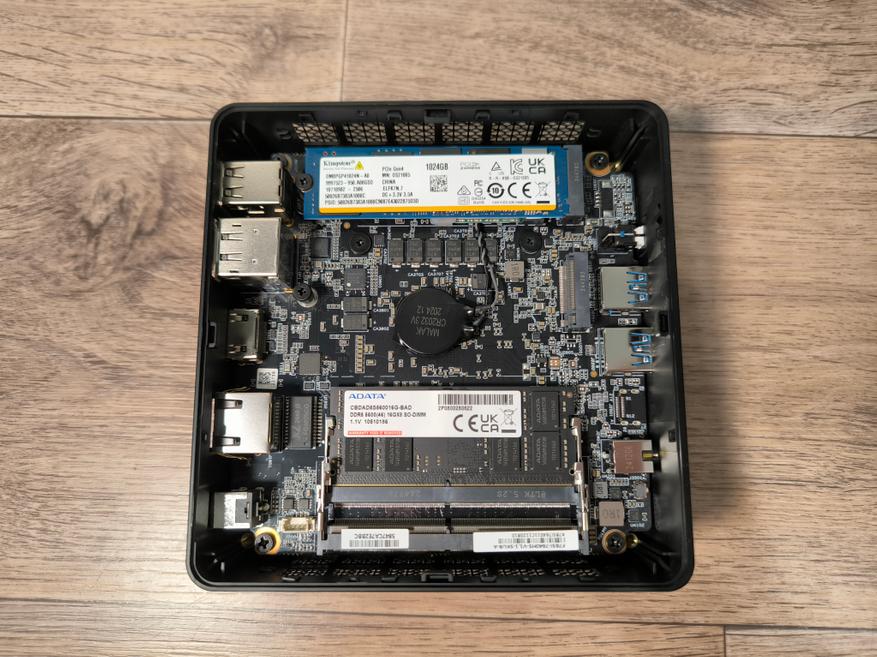 Кроме этого, компьютер имеет хорошее количество портов ввода вывода, и позволяет подключить к нему сразу несколько мониторов, несколько быстрых внешних SSD накопителей, и другое оборудование, работающее по интерфейсу USB. При желании, можно установить второй SSD накопитель, который будет работать в том же режиме PCI-E Gen4x4, как и основной SSD, и использовать мини-компьютер как устройство для хранения данных, так как в наличии есть быстрый 2.5Гигабитный Ethernet порт, благо доступные по цене роутеры с 2.5Гигабитными Ethernet портами уже есть в продаже. Встроенный WI-FI 6E адаптер так же способен обеспечить достаточно приличные скорости передачи данных.
