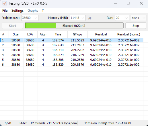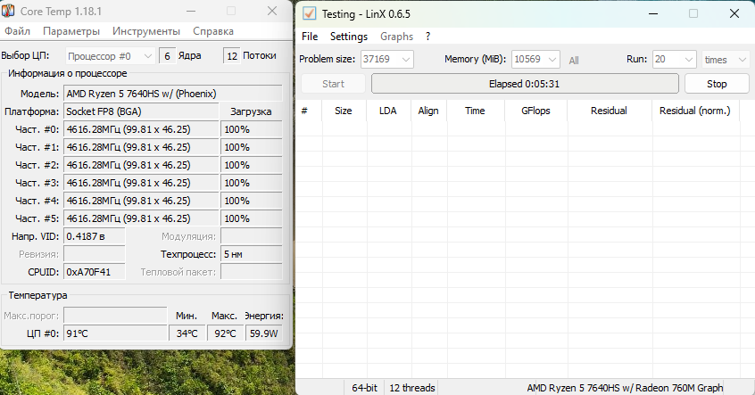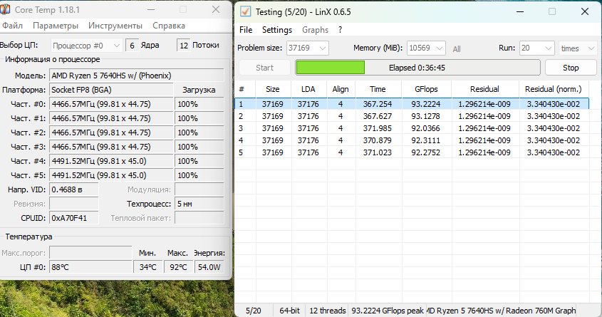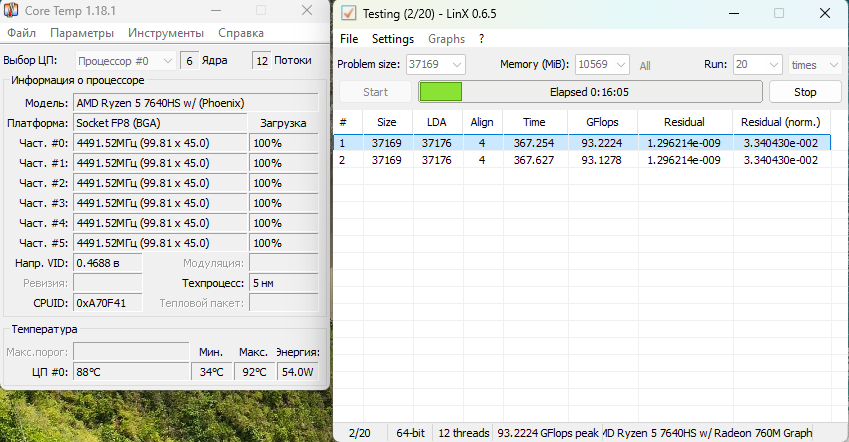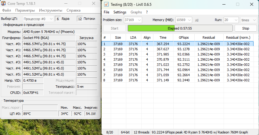 В тесте LinX 0.6.5, при выделении всей доступной оперативной памяти (~10ГБ), процессор Ryzen 5 7640HS набирает около 93GFlops, что с одной стороны достаточно скромно, а с другой стороны, объясняется видимо плохой оптимизацией под эту версию программы, использующую инструкции AVX, так как в тесте 7Z (о нём чуть позже), Ryzen 5 7640HS бился практически на равных с гораздо более прожорливым I5-11400F, который в том же LinX 0.6.5 набирает около 211GFlops, при использовании двух планок памяти DDR4 3600МГц, с ёмкостью по 8ГБ.