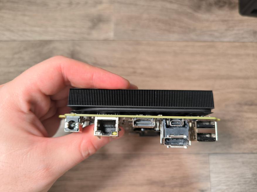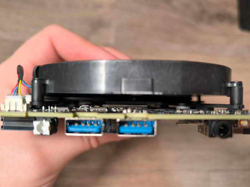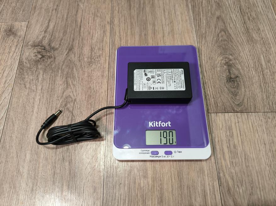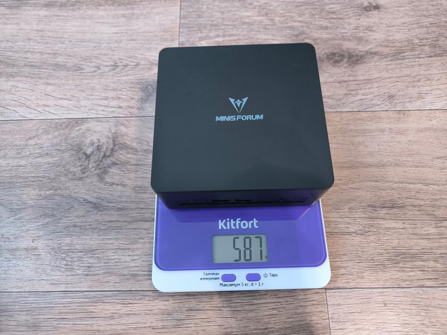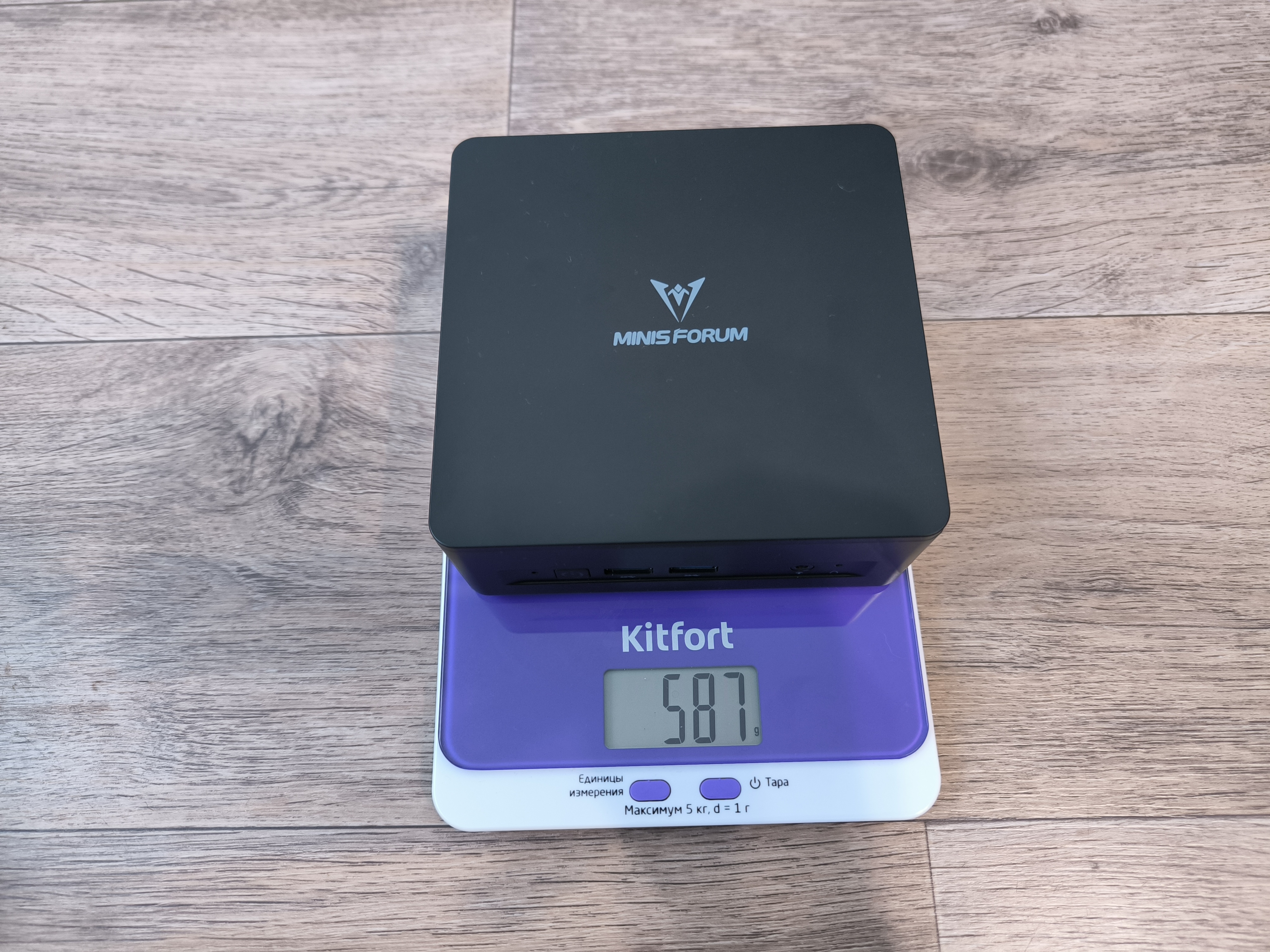 Для своих габаритов, мини-компьютер имеет достаточно приличный вес, и он ощутимо тяжелее мини-компьютеров на том же Intel N100, где нет таких требований к системе охлаждения, так как процессор потребляет значительно меньшую мощность, при ощутимо меньшей производительности. Блок питания так же имеет приличный вес, составляющий около 190 грамм (без учёта кабелей), что соответствует заявленной мощности.