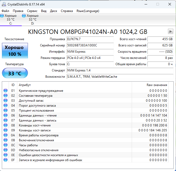Взглянем теперь на предустановленный SSD Kingston OM8PGP41024N, с объёмом 1ТБ.