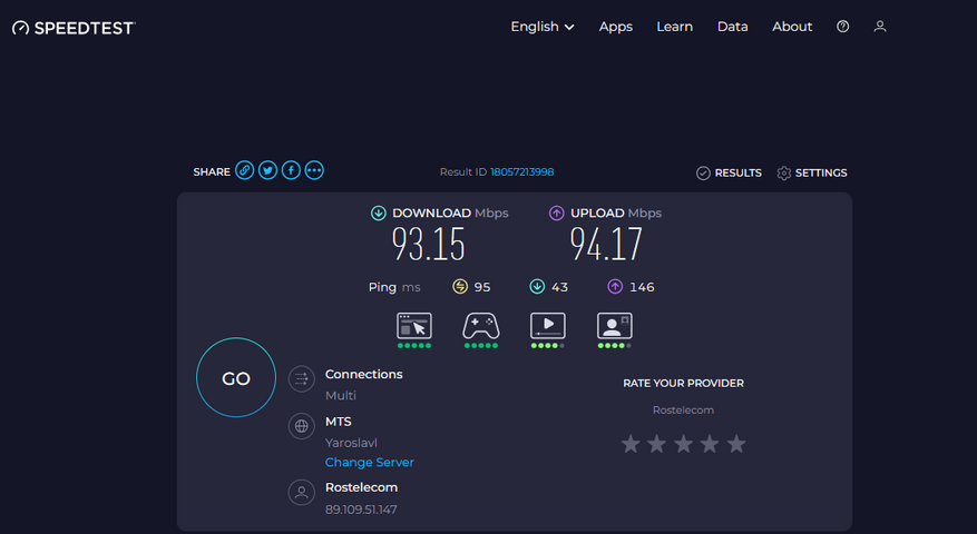 Мой провайдер предоставляет скорость до 100Мбит/c, что в реальности соответствует пределу в 94Мбит/c, «по проводу», в обе стороны. При запуске теста с мини-компьютера Minisforum UM760 Slim, я получил те же значения, что я наблюдал при тестировании через Ethernet.