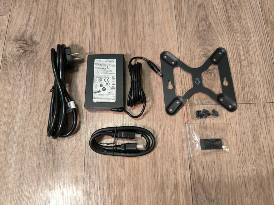 Кроме мини-компьютера, в комплекте идёт блок питания, кабель для подачи питания, простенький HDMI кабель с длиной 1м, планка для крепления мини-компьютера к монитору, крепёжные винты, и две запасных ножки.