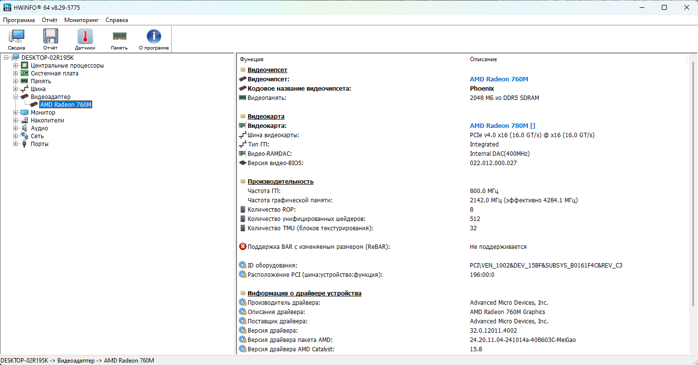Встроенное видеоядро Radeon 760M, под которое по умолчанию выделено 2ГБ памяти, но можно выделить вплоть до 16ГБ (естественно, оперативной памяти должно быть более 16ГБ).