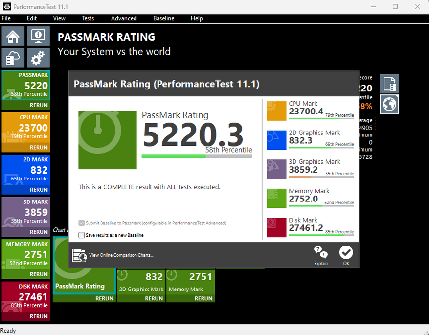 В однопоточном тесте Cinebench R32, процессор набрал 1772pts, а в многопоточном 13308pts. В программе PerfomanceTest 11.1, компьютер набрал суммарно 5220 баллов, и процессор занял 79 место, с результатом 23700 баллов. Это цифры чисто для сравнения с другими процессорами.