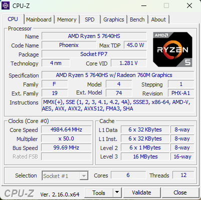 | Процессор: | AMD Ryzen 5 7640HS (Zen 4, 6 ядер, 12 потоков, максимум 5ГГц в бусте) |