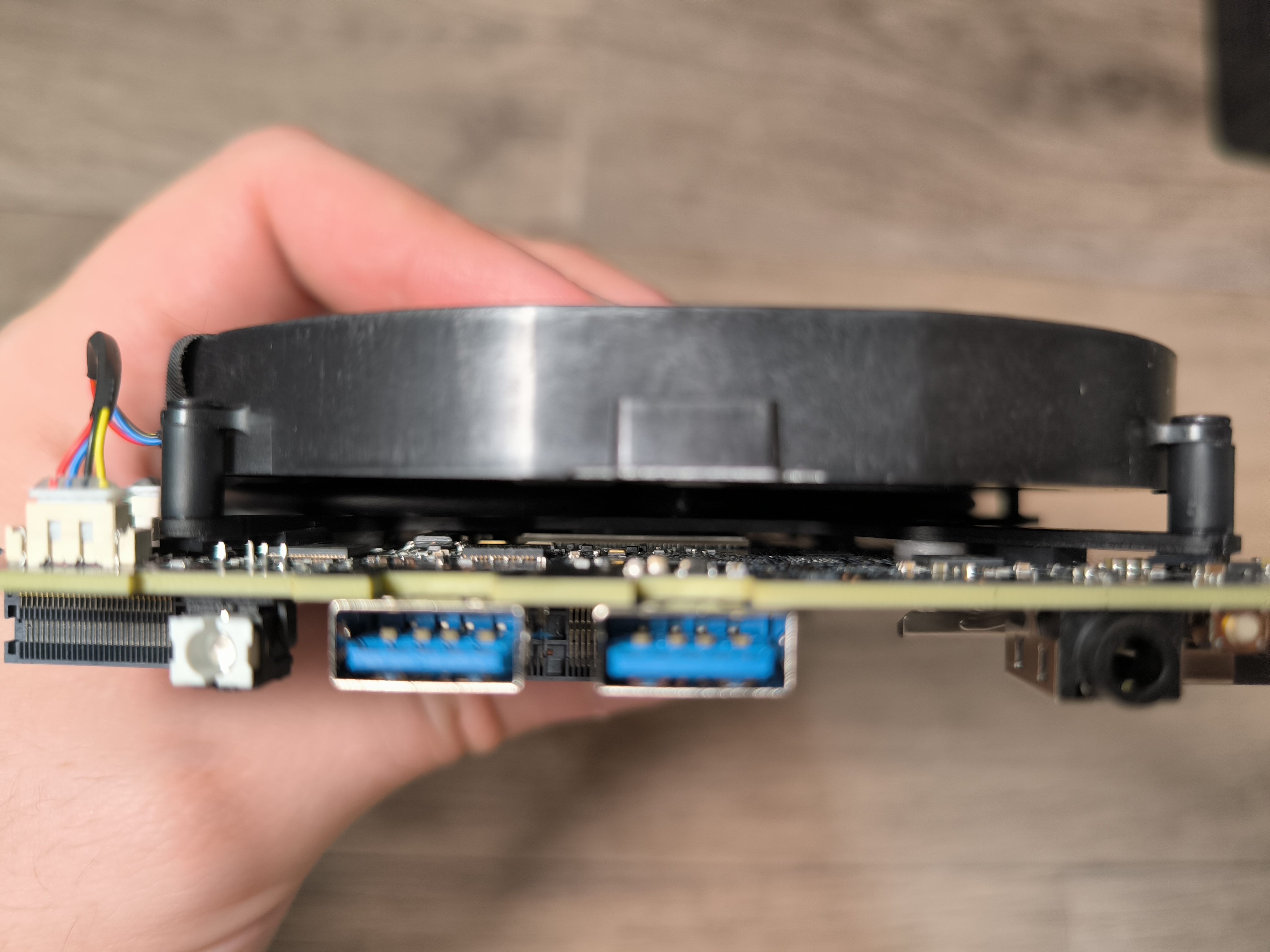 Система охлаждения имеет достаточно крупный радиатор (относительно размеров корпуса мини-компьютера), тепло на который передаётся с помощью двух тепловых трубок. Для эффективного охлаждения радиатора, используется вентилятор Elepeak BA512BSHNF2300TR, с ШИМ управлением (4Pin). Для того что бы произвести очистку системы охлаждения от накопившейся пыли, достаточно снять лишь вентилятор, не разбирая всю систему целиком.