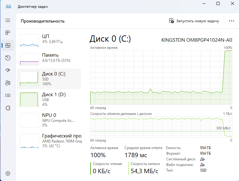 По итогу, я могу отнести низкую скорость записи предустановленного SSD накопителя, после исчерпания SLC кэша, к недостаткам компьютера. При этом, данный SSD обеспечивает хорошую производительность в большинстве сценариев использования, и он от надёжного производителя, но в то же время, он теряет универсальность, из-за ограничений по скорости записи, которые неизбежны при использовании QLC памяти. Пользователь может столкнуться с низкой скоростью записи, если захочет записать большой файл за раз, либо почти полностью заполнит SSD, и решит записать что-то относительно небольшого размера, плюс во время такой записи могут тормозиться параллельно выполняемые операции, из-за 100% загрузки накопителя.