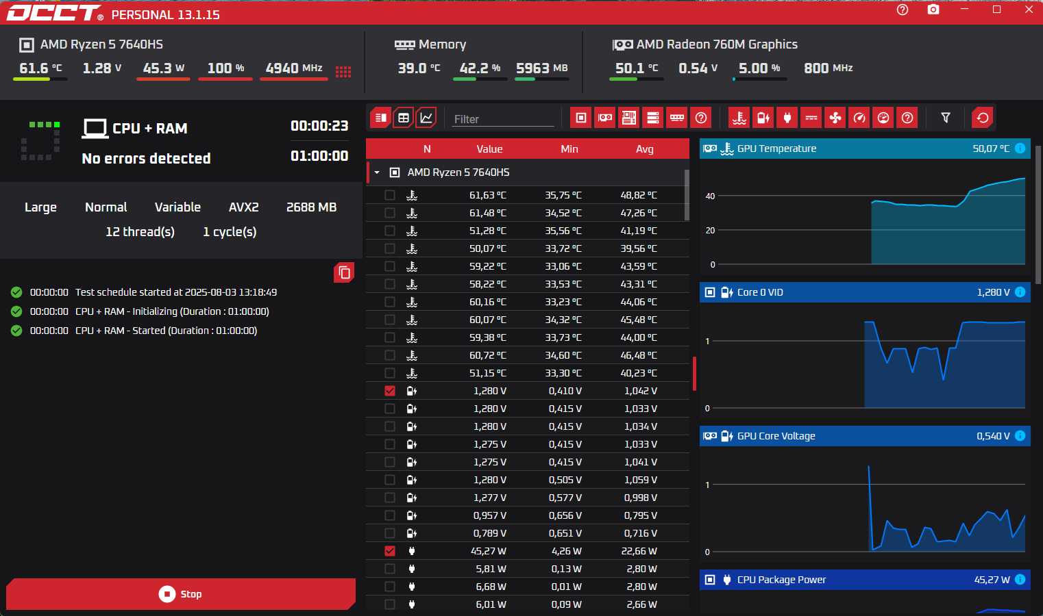 С учётом того, что базовая частота процессора Ryzen 5 7640HS составляет 4.3ГГц, получается, что процессор даже в очень тяжёлых условиях теста, работал пусть и с небольшим, но бустом в 200МГц, так как базовая частота уже и так высока (особенно, для сегмента, к которому относится процессор).