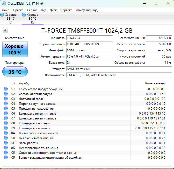 Как видно со скриншота, SSD заработал в режиме PCI-E Gen4x4.