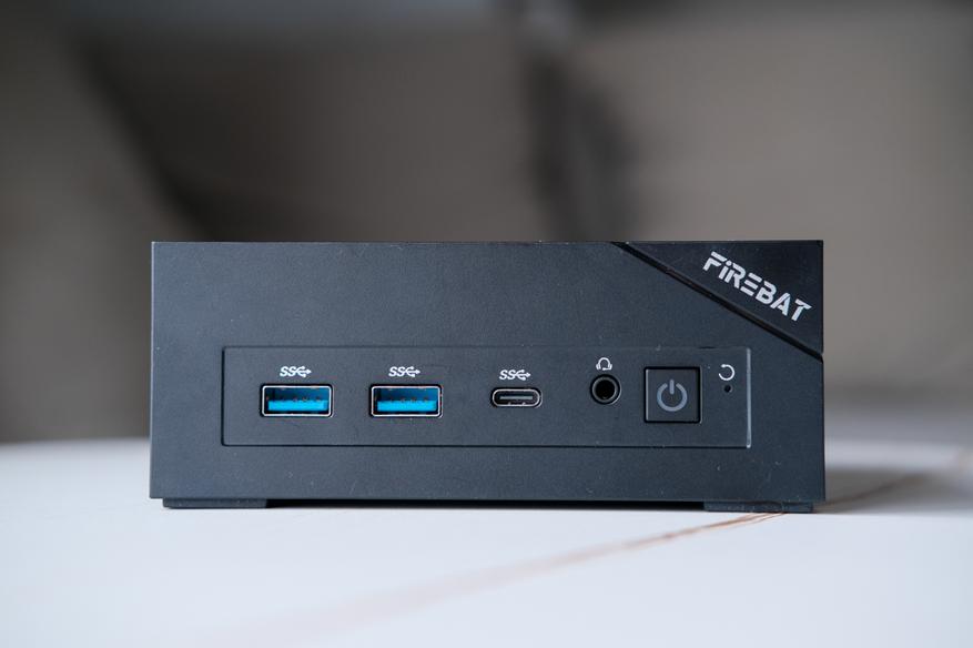 На лицевой стороне мини-ПК Firebat AM02 расположились кнопка включения, разъём для подключения колонок/гарнитуры, порт type-C и два порта USB-A 3.2.