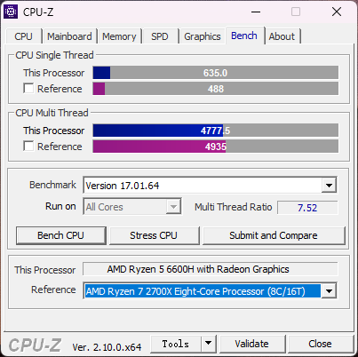 С точки зрения совместимости это процессор для сокета AMD Socket FP7 с TDP 45 Вт. Имеется поддержка памяти DDR5. По внутреннему бенчмарку CPU-Z, AMD Ryzen 5 6600H набрал 635 и 4777 очков в одноядреном и многоядерном тестах.