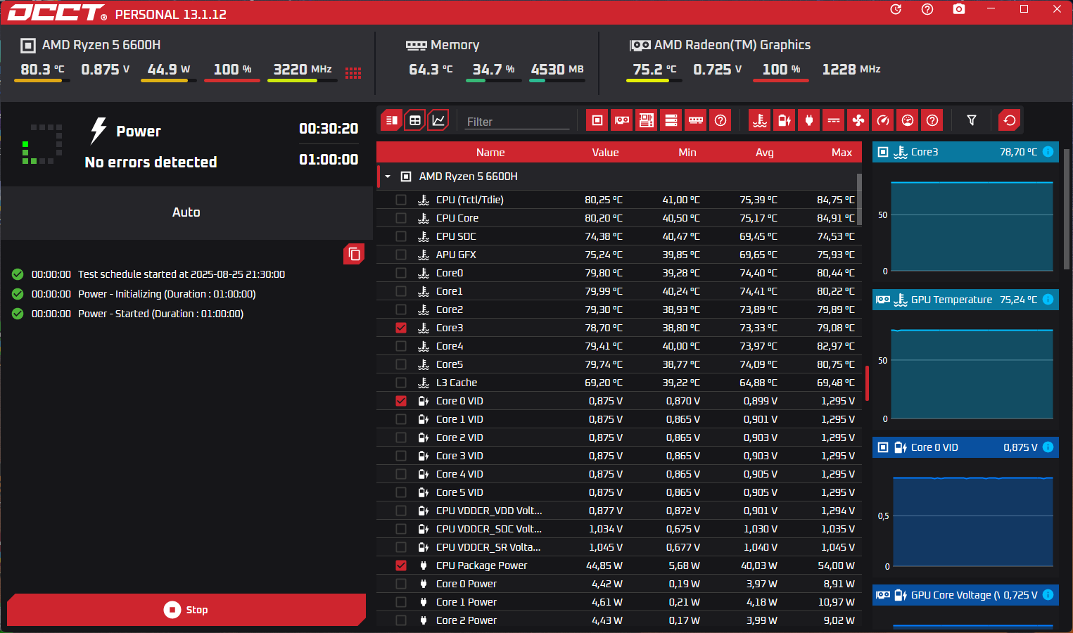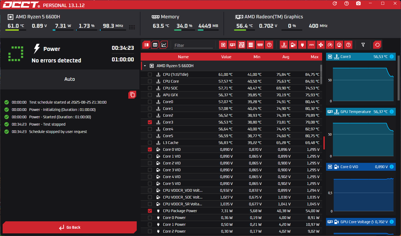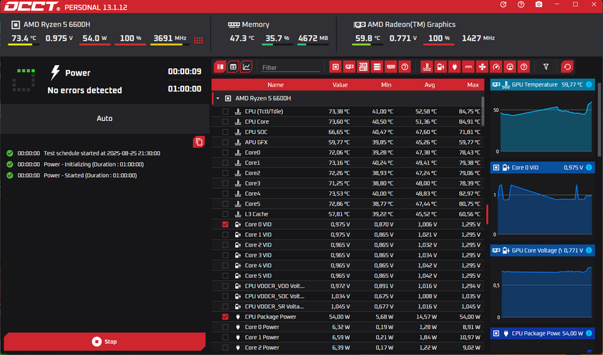 Ну и раз у нас пошли стрессы, то следом запускаем OCCT и тоже нагружаем неттоп по полной. Тут кстати уже в отличии от AIDA можно подробнее посмотреть больше параметров. К тому же Aida у меня на этом компе запускается наполовину на китайском, наполовину на английском. Что не очень удобно (не нашёл как победить)