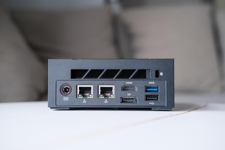 DC для подключения питания, два гигабитных LAN, HDMI, DP, USB-A 3.2 и USB-A 2.0. Ну и замок Кенгсинтона. А чуть выше решётка радиатора, через который выдувается горячий воздух
