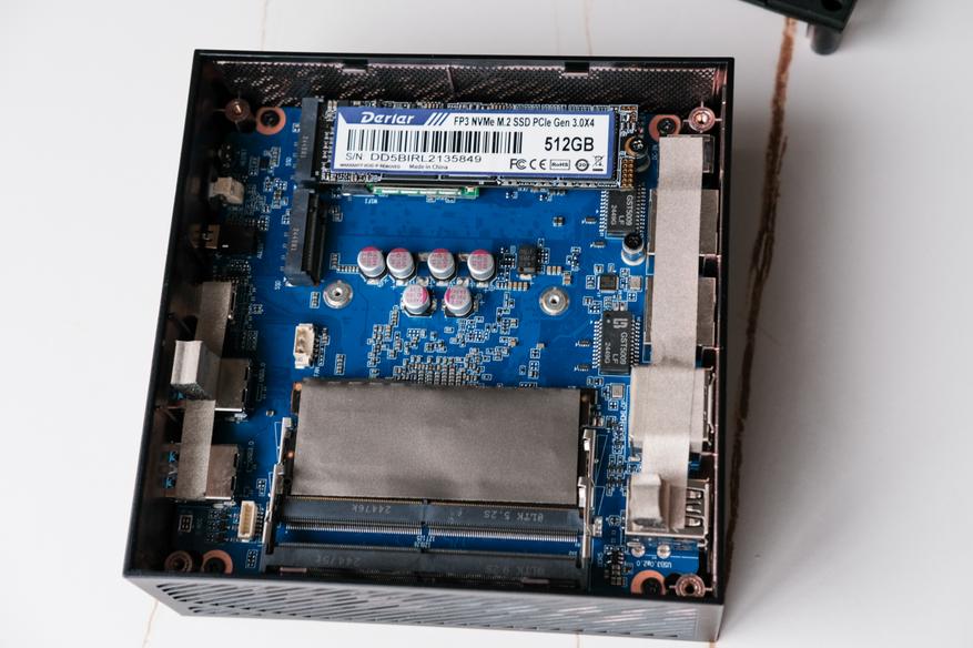 Здесь установлен SSD NVMe M.2 PCIe Gen3.0x4 производства Derler. Объём 512гб, это уже наверно минимально комфортный уровень. Что касается самого производителя Derler, то SSD их производства можно встретить во множестве разных ноутбуков и мини-ПК. Бренд довольно надёжный, но как правило не сильно представленный в обычной рознице в странах СНГ.