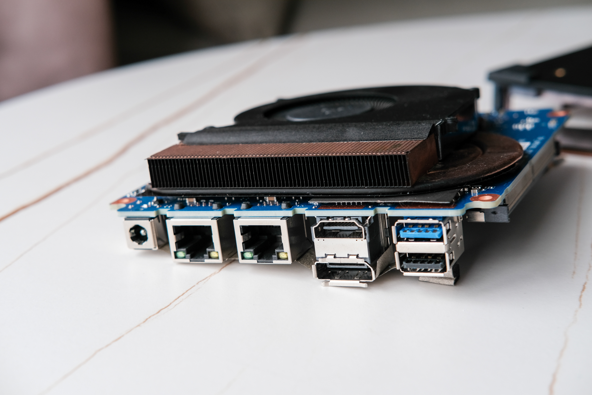 Убрав память, можно увидеть остальную компоновку материнской платы компьютера. Ну и увидеть что тут установлена сетевая карта