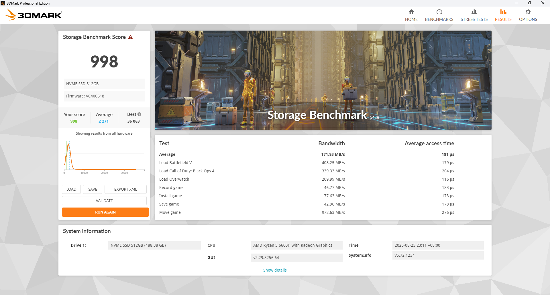 Тесты 3D Mark на скриншотах ниже. Можно сравнить с аналогичными системами. В Steel Nomad light набралось 1127 очков, а в Storage benchmark 998 очков
