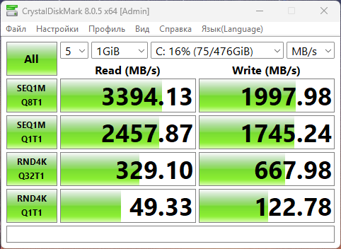 Тест скорости чтения и записи в CrystalDiskMark на скриншоте ниже