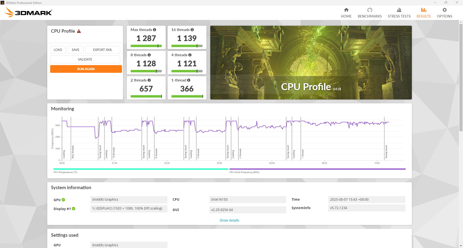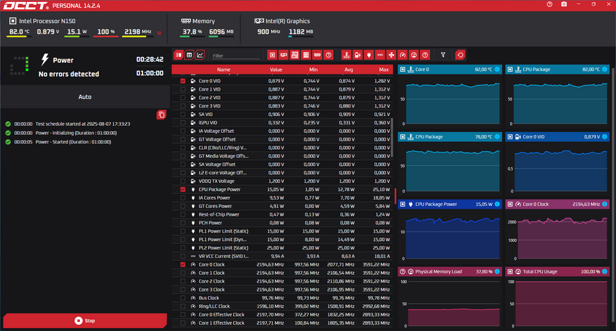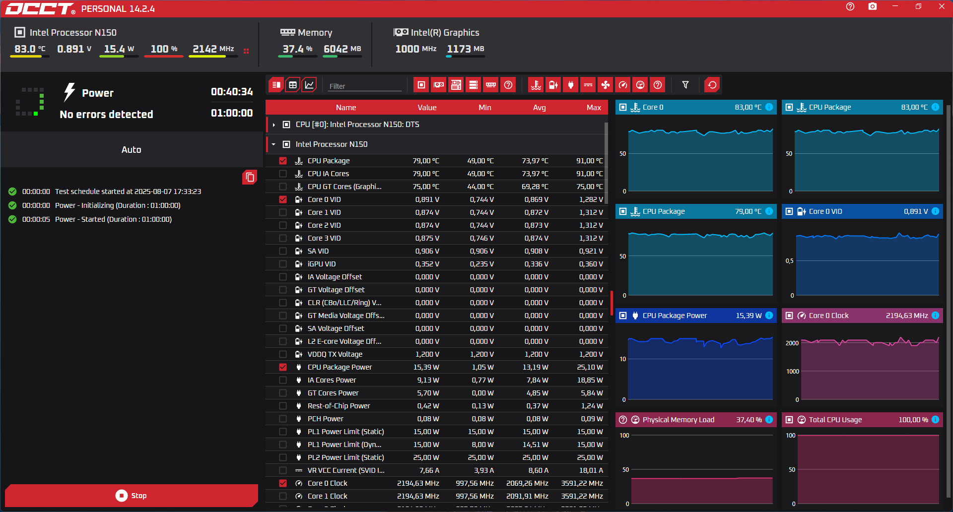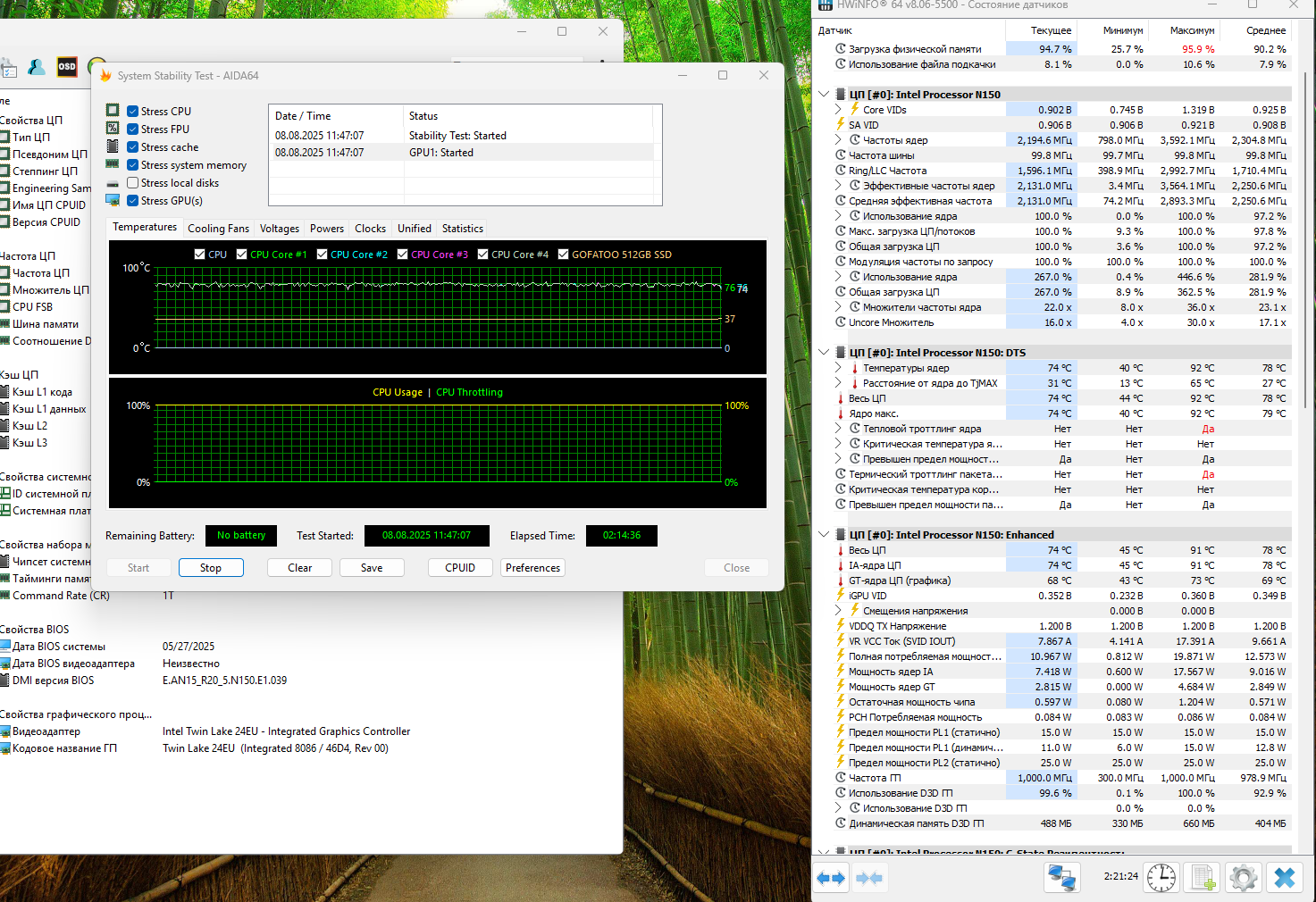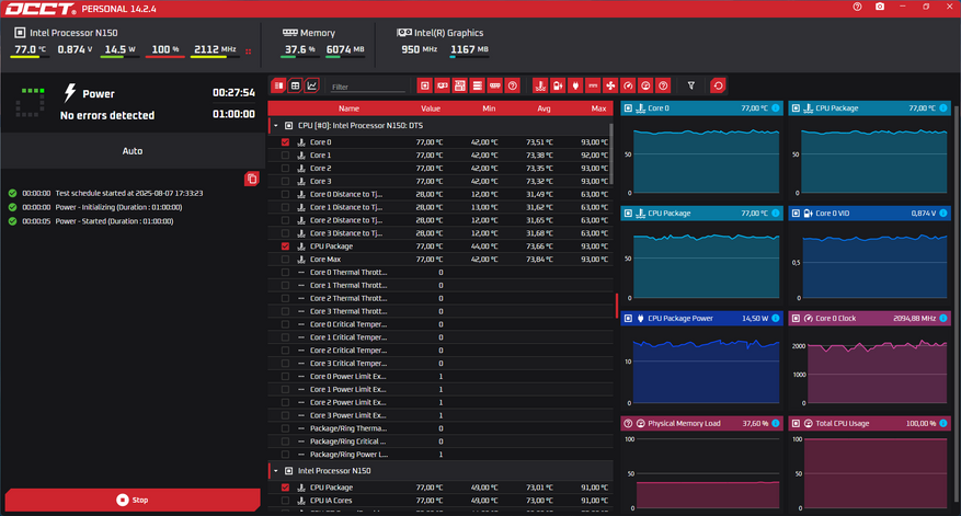 О том что я запустил тест я вспомнил только два часа спустя, но что меня удивило, так это производительность. 25W для Intel N150. Вы такое когда-нибудь видели? При том что с завода он заявлен как процессор с TDP 6W, а у большинства производителей работает разогнанным до 15Вт. Здесь же 25Вт. Но как результат, есть троттлинг. Увы, чудес не случилось. При полной нагрузке системе охлаждения надо отводить больше тепла, особенно если нагрузка как в моём случае длилась более 2 часов.