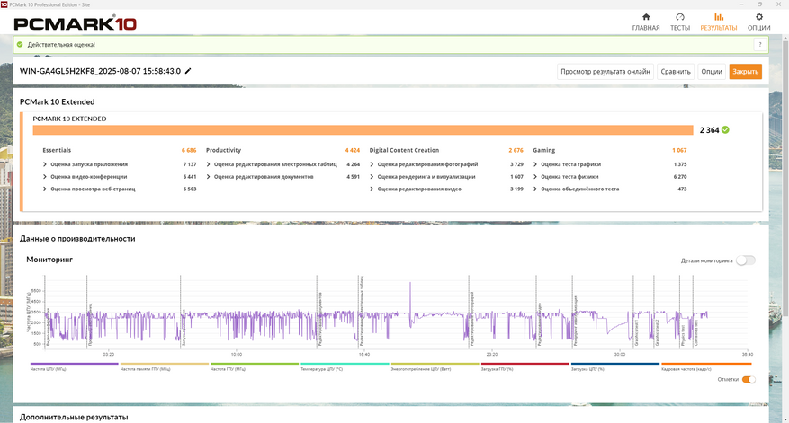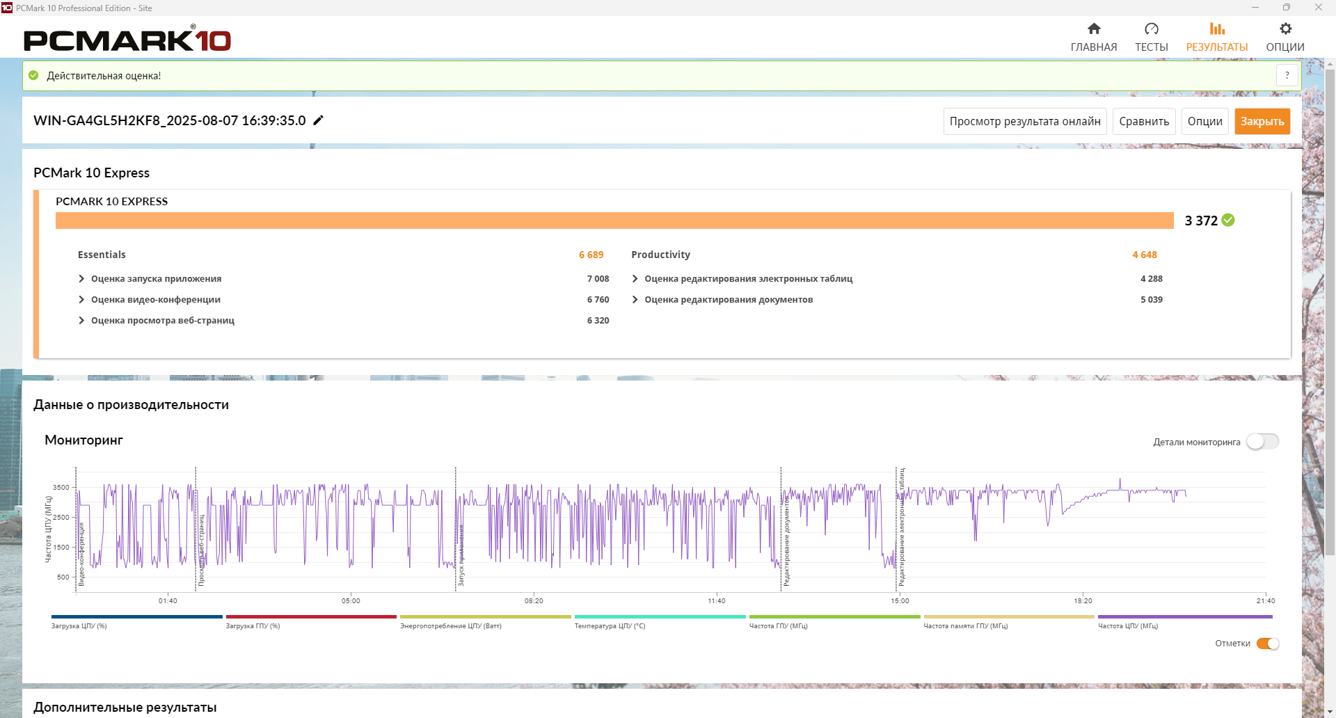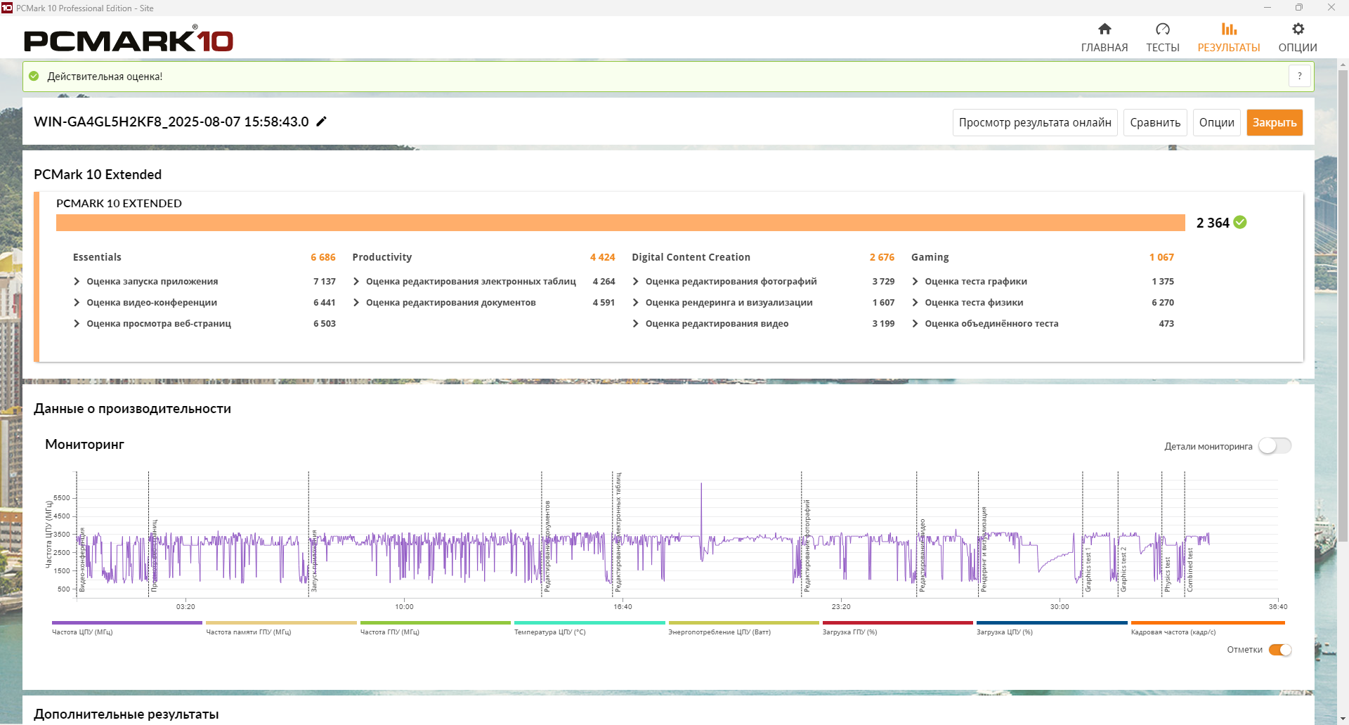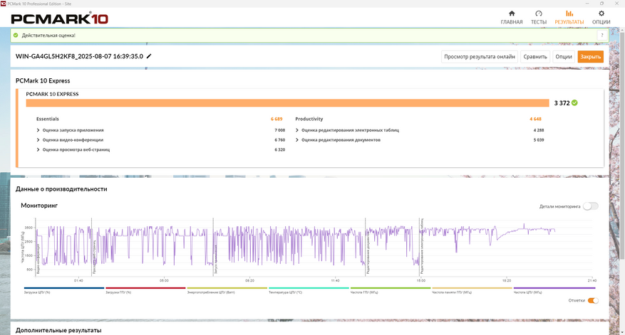 Ну и так как это офисная система, провёл тест на современный офис в программе PCMark10. Быстрый тест набрал 3372 балла, а подробный 2364 баллов. Что для офисных систем более чем достаточно.