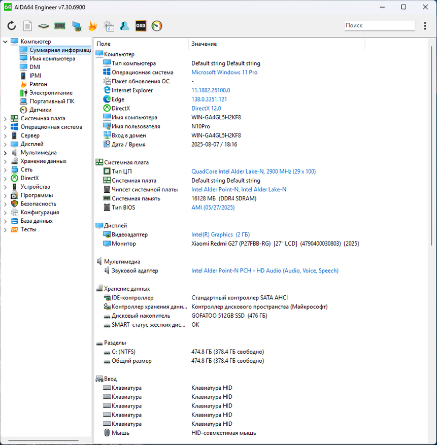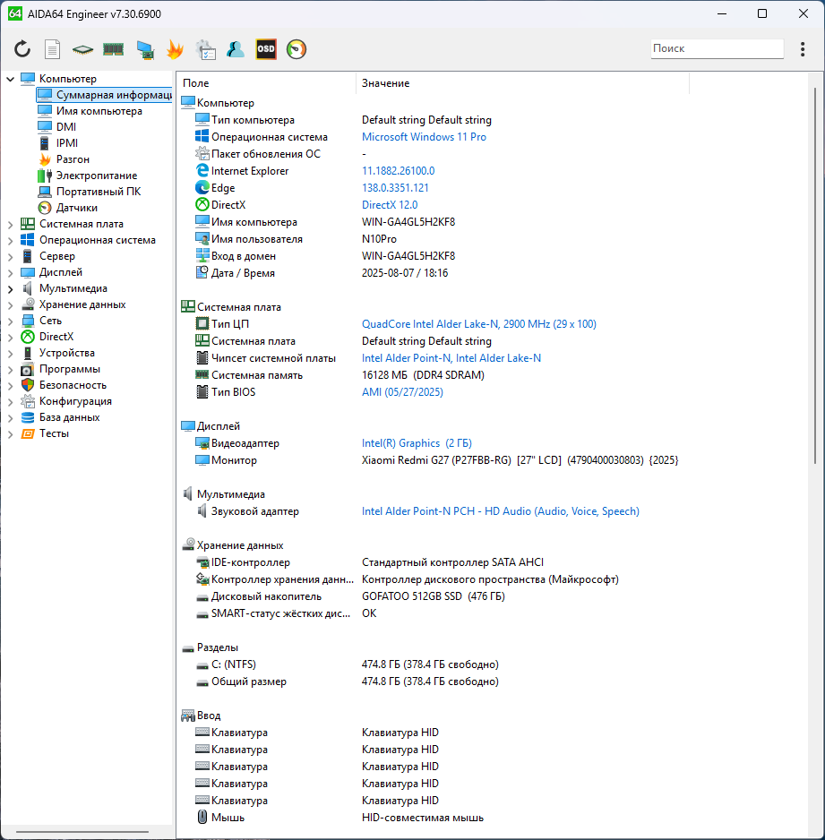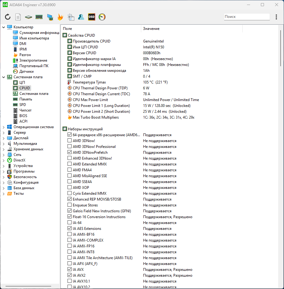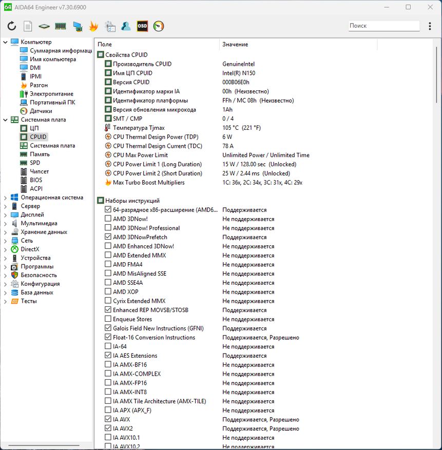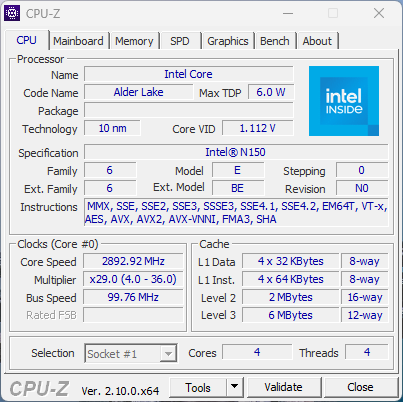 Перед нами уже можно сказать классический, или даже народный Intel N150, который был представлен 1 января 2025 года как энергоэффективное решение для портативных и офисных устройств. Чип оснащён четырьмя ядрами и четырьмя потоками, построен по техпроцессу Intel 7. Максимальная тактовая частота достигает 3.6 ГГц, а множитель в этом процессоре неразгоняемый. Совместим с разъёмом FCBGA1264. Поддерживаются типы оперативной памяти: DDR4-3200, DDR5-4800, а также LPDDR5-4800 — в зависимости от конфигурации устройства. В нашем же устройстве память работает на частоте 2666, и в целом это более чем достаточно.