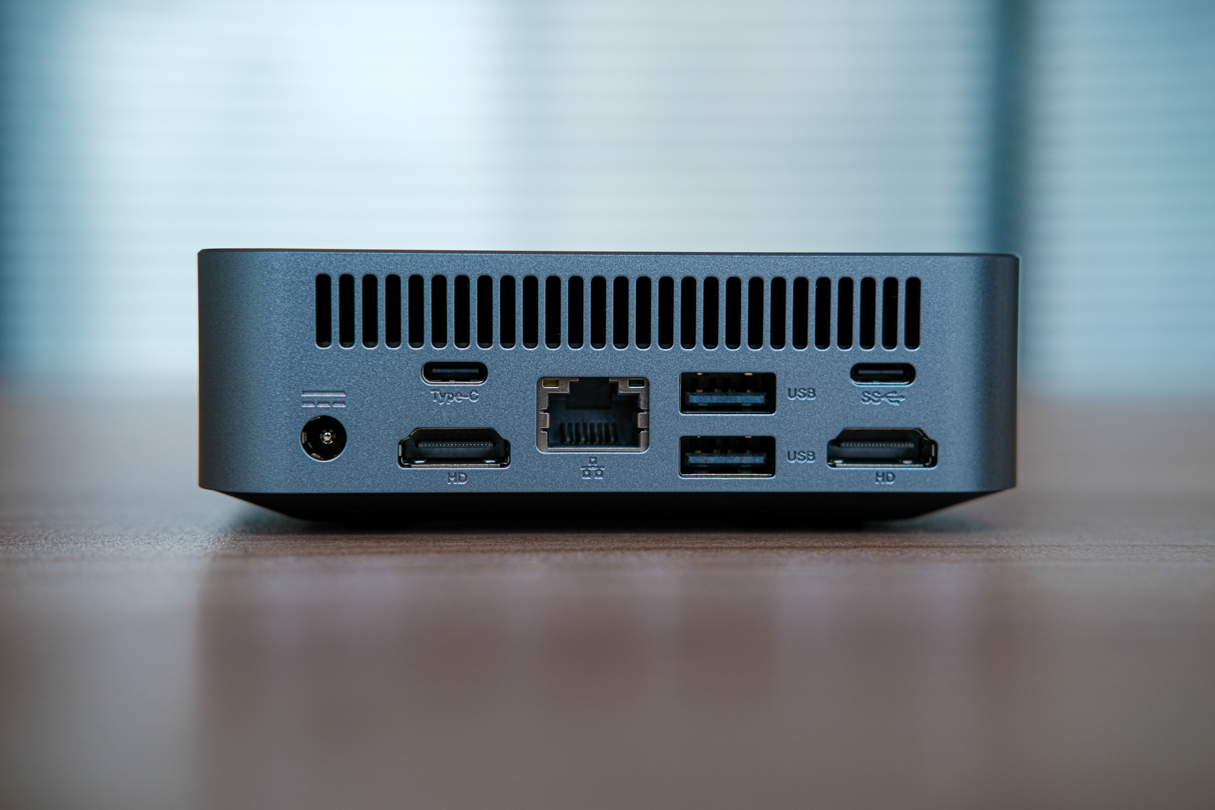 На задней стороне расположились ещё два USB порта, два Type-C порта, два HDMI, сетевой 2.5G порт и порт DC для подключения питания. Тут же решётка через которую выдувается воздух от системы охлаждения.
