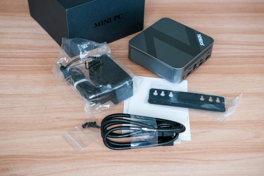 Внутри коробки можно обнаружить сам мини-ПК, блок питания, набор крепежа для Vesa (планка и винты), шнур HDMI и инструкцию
