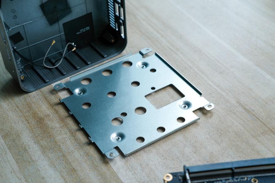 Внутри помимо основной материнской платы имеется защитная металлическая пластина. Она нужна, для того чтобы распределять температуры, добавить жёсткости конструкции и защитить элементы от случайных посторонних предметов.