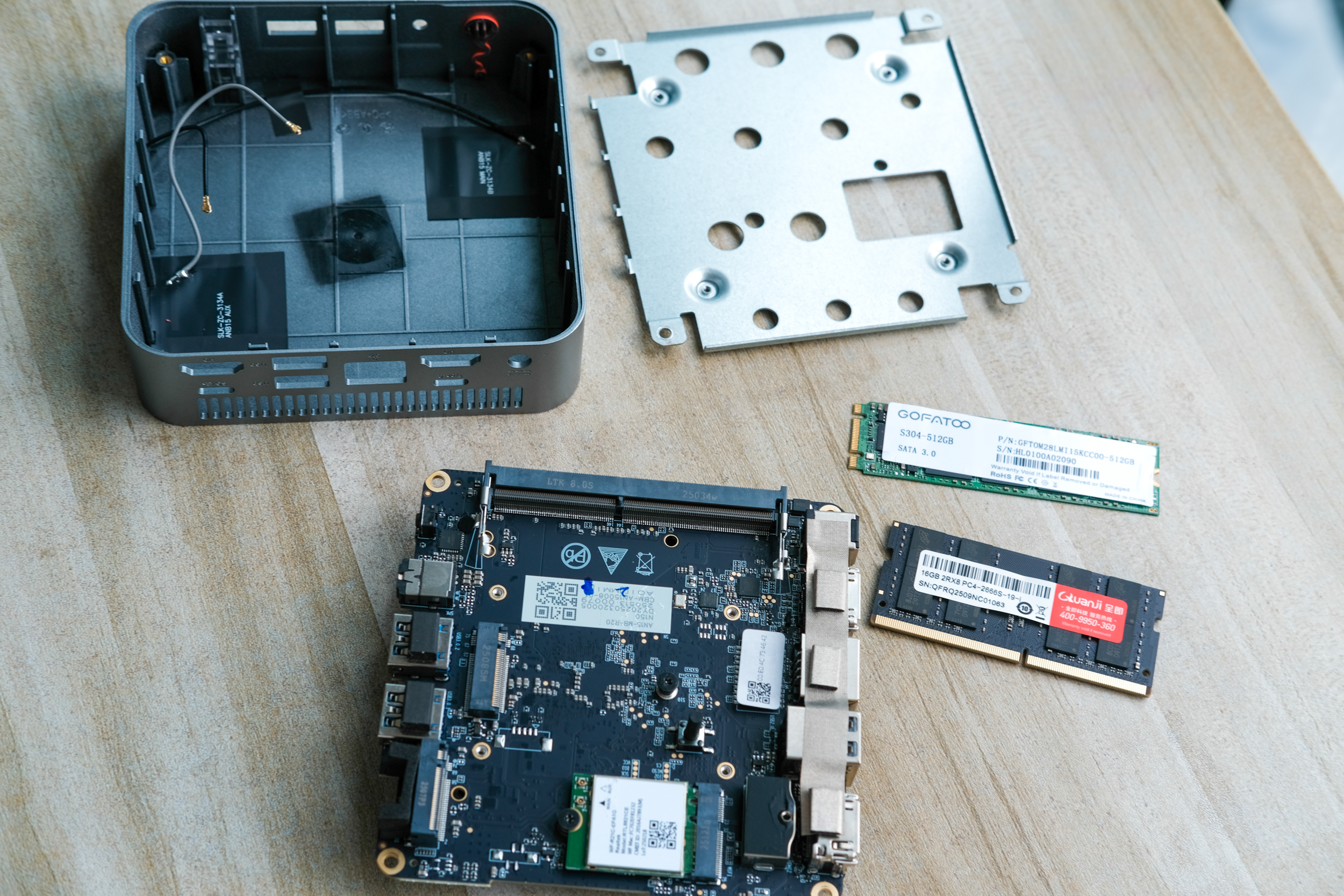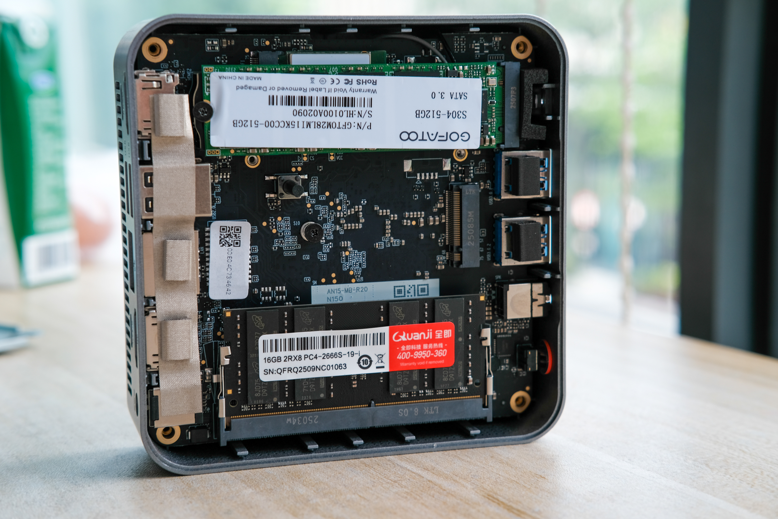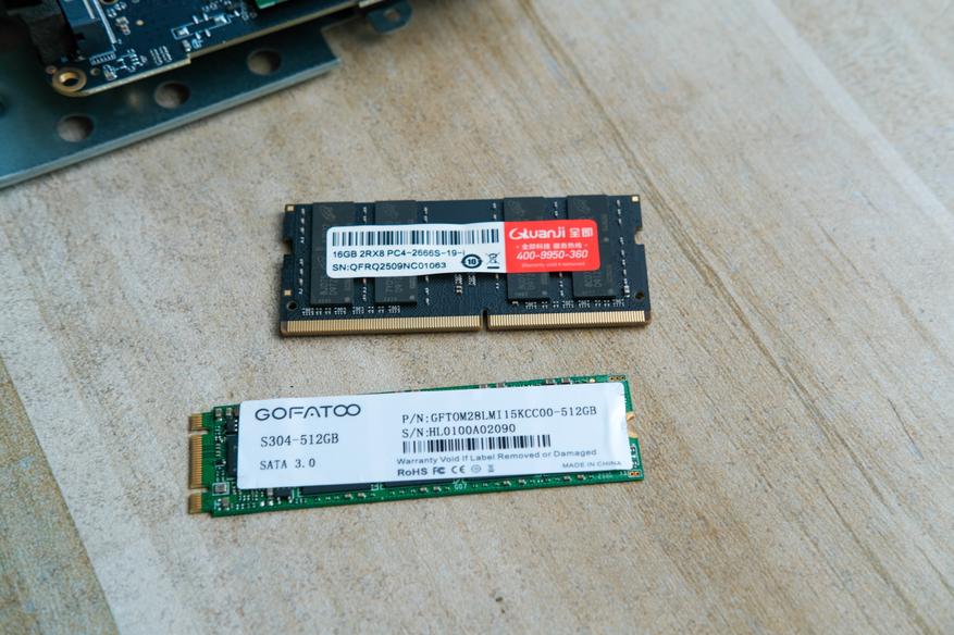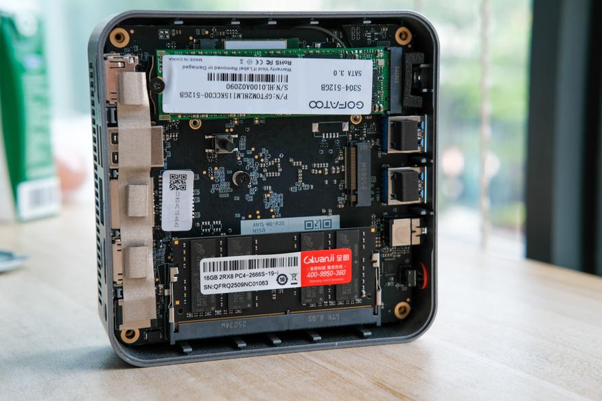 Что касается внутренней компоновки, то здесь можно увидеть SSD от производителя Gofato (проверенный и достаточно известный производитель) и DDR4 память на 16Gb от QuanJi (известный производитель даже на територии СНГ)