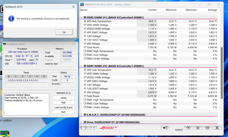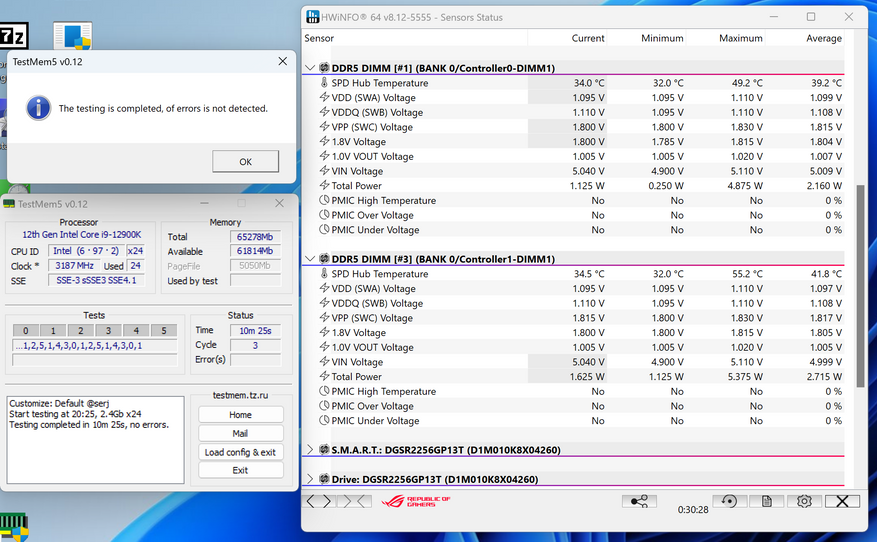 Естественно, никаких ошибок даже в тяжелых стресс-тестах. А вот тепловой режим уже менее комфортный. «Первый» модуль разогрелся уже почти до 50 градусов, у второго потребление оказалось чуть выше — и температура уже в 55,2°С. Хотя что тут причина, а что следствие — вопрос интересный: энергопотребление полупроводников зависит от температуры, запуская своеобразный замкнутый цикл, почему высокие температуры часто и нежелательны. Однако такие значения всё ещё очень далеки от критических, да и в реальной работе будет ниже.
