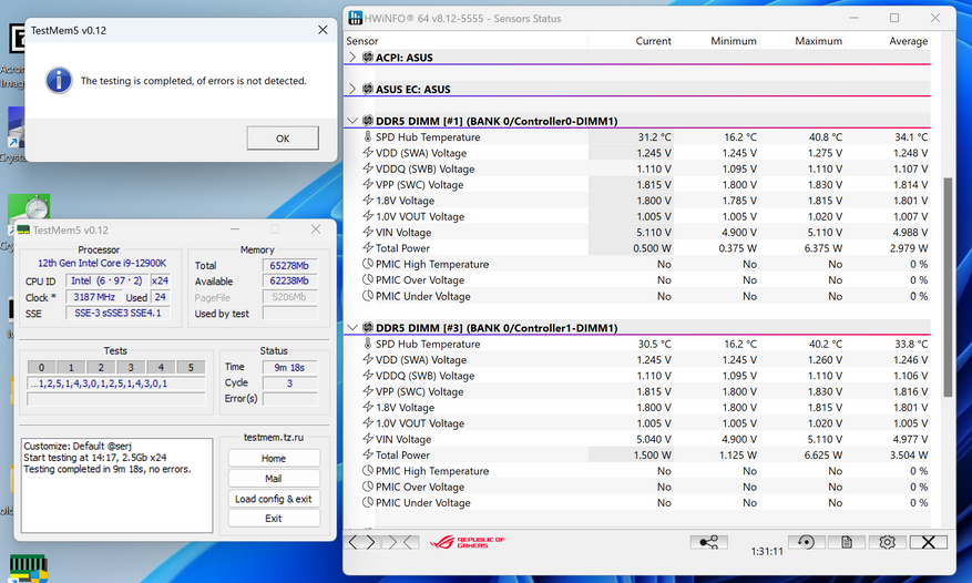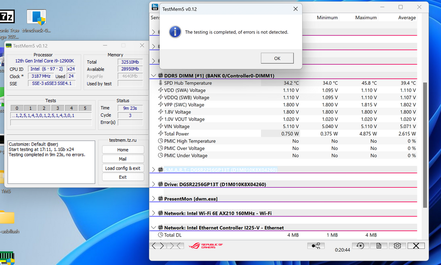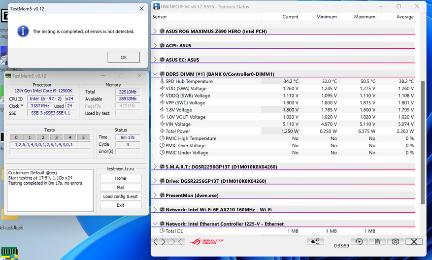 Радиаторов, естественно, нет, что позволяет полюбоваться на РСВ и компоненты. Вообще говоря, для DDR5 радиаторы рекомендуются — как раз из-за PMIC (это вот та самая группа микросхем в центральной части модулей), но можно и обойтись. Если, конечно, речь не идёт о каких-нибудь топовых комплектах, работающих на высоких частотах при существенно-повышенном напряжении — иногда и до 30%. Здесь они для штатного режима точно не пригодятся, а что будет с разгоном — посмотрим. Снаружи, в любом случае больше смотреть не на что, так что установим модули в системную плату Asus ROG Maximus Z690 Hero на чипсете Intel Z690 с процессором Intel Core i9-12900K и попробуем посмотреть — что внутри.