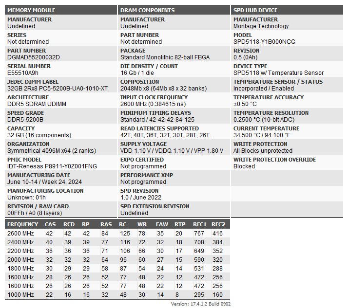 Увы, но пока ничего существенного определить не удалось — не знает Thaiphoon Burner годичной давности (но свежее нет) этих компонентов, либо виновата информация в SPD. Точнее, её отсутствие. Собственно, и на чипах памяти маркировка Digma под заказ — концы спрятаны хорошо :) Так что придётся просто перейти к практическим тестам, не пытаясь добыть априорную информацию. Кой-какая при этом есть — можно обратить внимание на относительные тайминги для режима DDR5-4800 и сравнить их с приведёнными для таких модулей официально. Похоже? Никто и не сомневался.