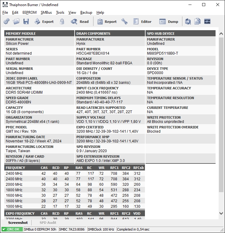 Производитель памяти Hynix, о чем сообщает программа Thaiphoon Burner. Есть зашитые профили EXPO и XMP на эффективной частоте 3200 МГц, ну, или более привычные 6400 МГц.