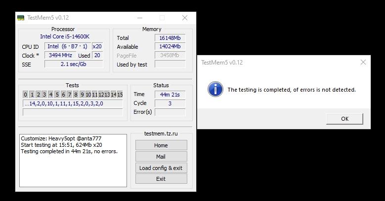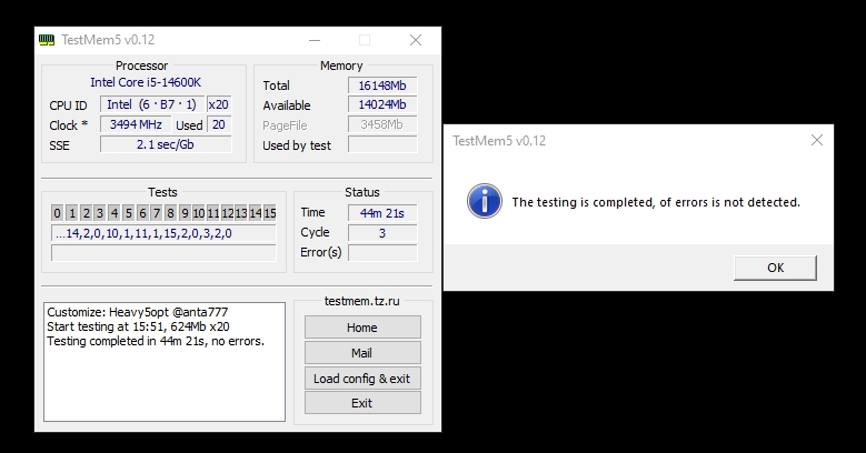 Все тесты модуль оперативной памяти прошёл отлично, в том числе TestMem5 с тяжёлым профилем anta777, который тестирует память в сложных условиях и выявляет малейшие проблемы со стабильностью, что очень важно.
