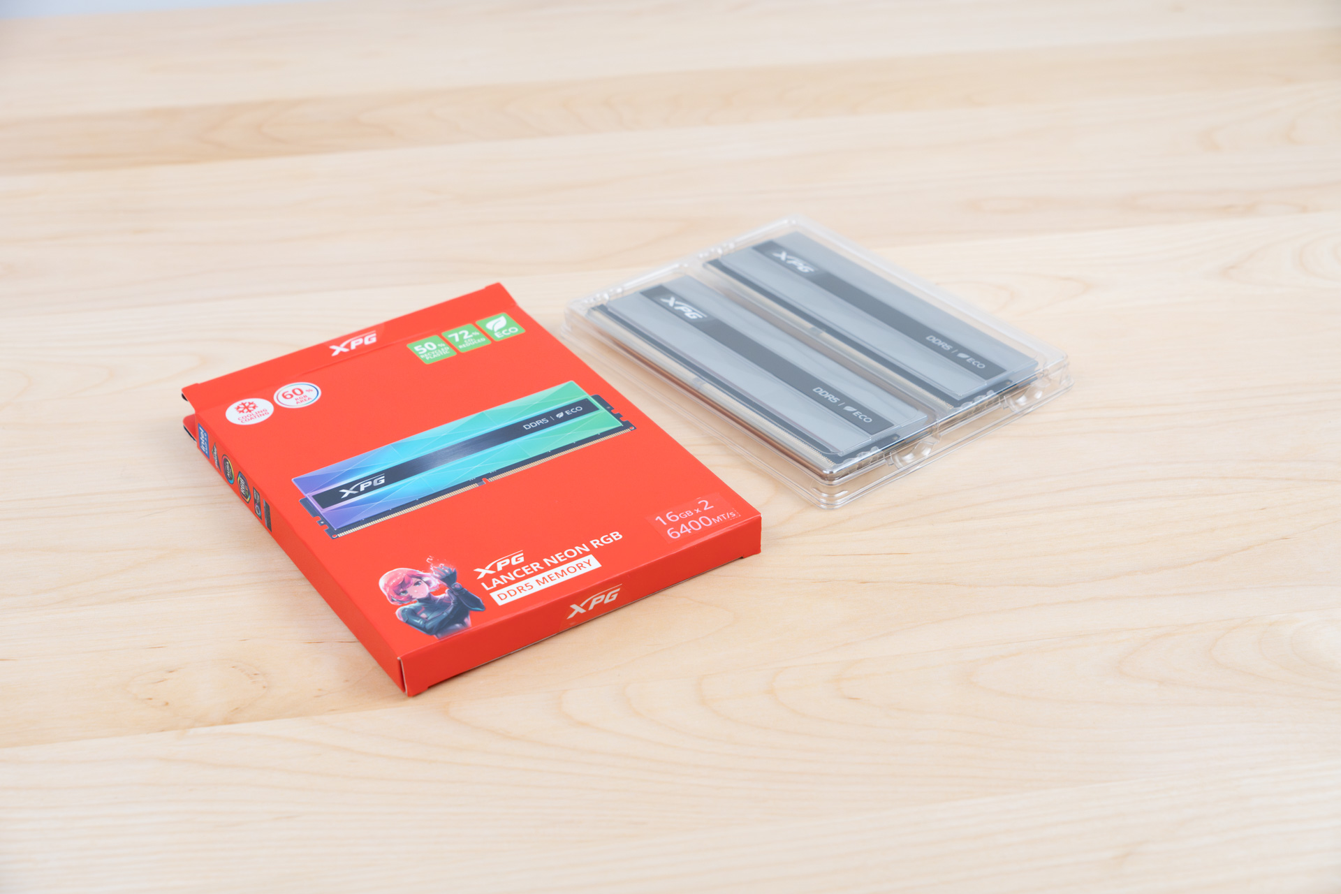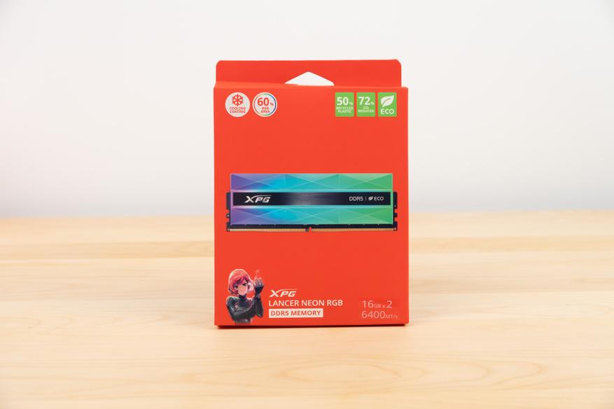 Оперативная память xpg lancer neon rgb поставляется в простой коробке красного цвета. На передней стороне нанесены основные фишки которым примечательна эта память. Например ргб подсветка покрывает аж 60% всего корпуса, а эко серия приметна тем что 50% пластика что использованы в корпусе — были переработаны.