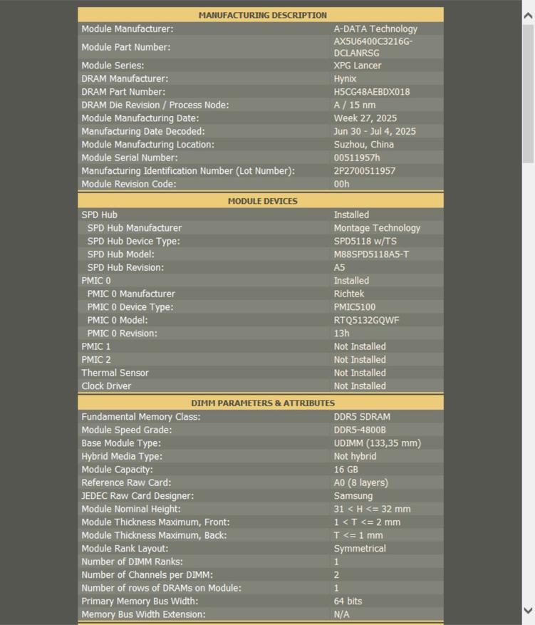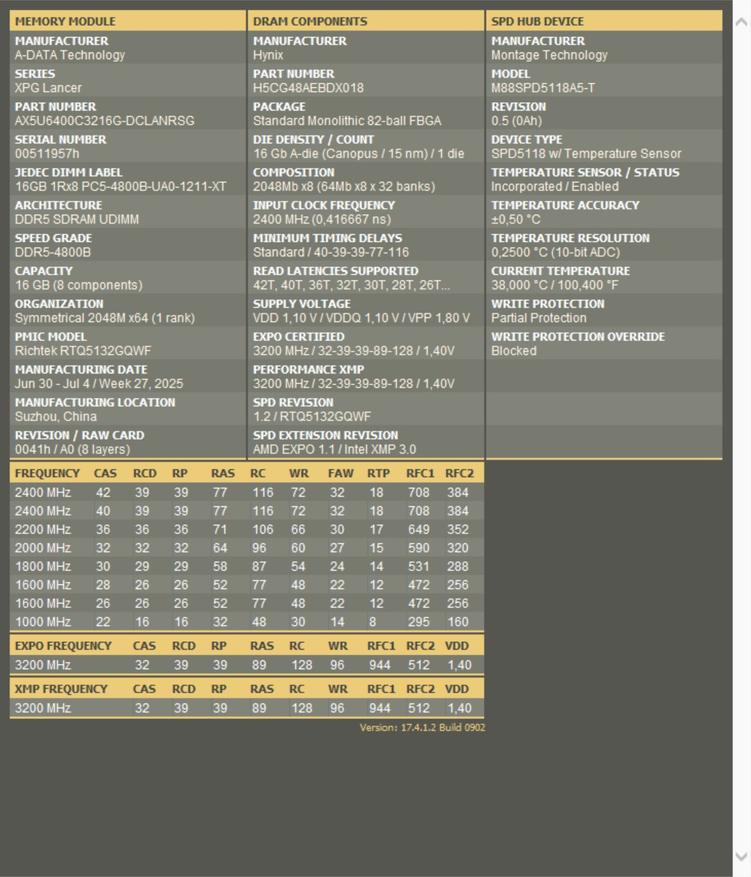 Полный отчет от тайфуна говорит нам о приятной картине. Под капотом планки установлены свежие чипы Hynix A-Die которые очень неплохо относятся к разгону.