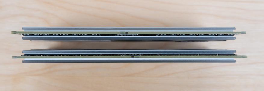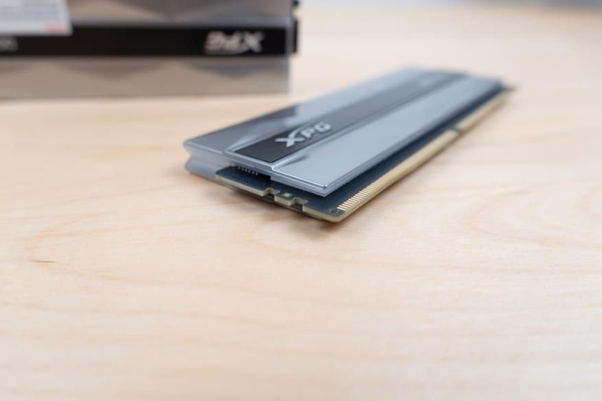 Если посмотреть с торца то можно отчетливо увидеть конфигурацию банок памяти. Каждая плана несет на себе 8 чипов по 2гб каждый. Все чипы расположены на одной стороне, и охлаждаются об пластиковый радиатор который одновременно является рассеивателем для argb подсветки.