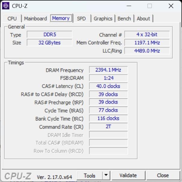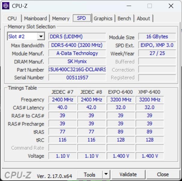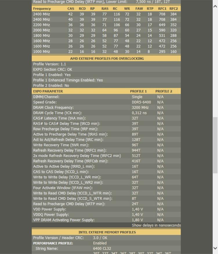 Отчет Cpu-Z показывает нам интересную картину. В стоке память имеет JDEC профиль на 2400мгц при таймингах 40-39-39, есть второй профиль Jdec с немного завышенными таймингами, а так же профили XMP для intel и EXPO для AMD на частоте 6400мгц при таймингах 32-39-39.