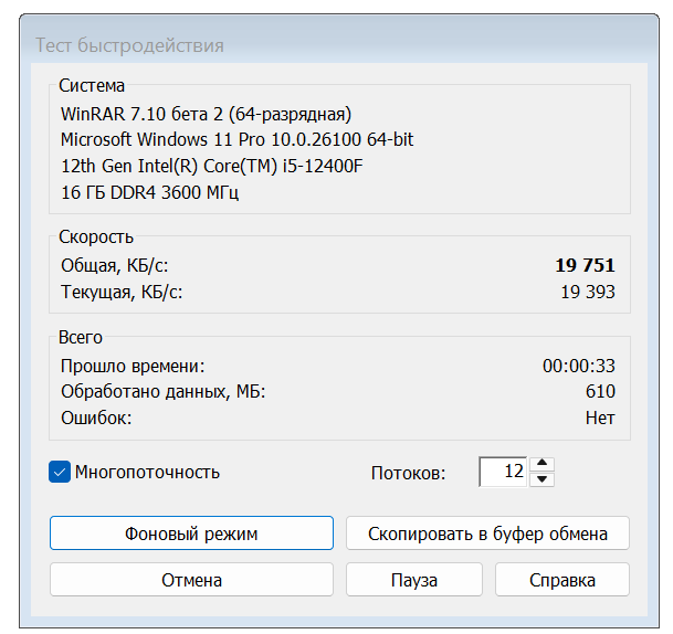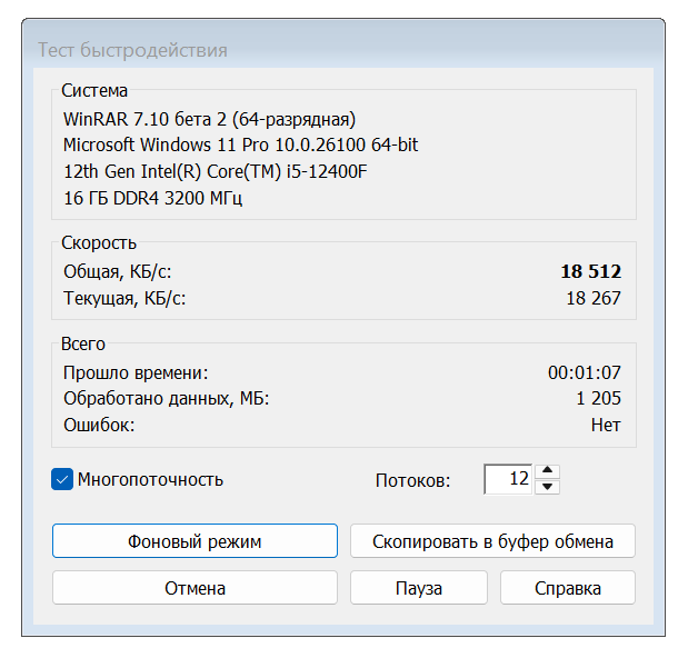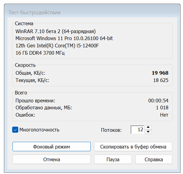 Результат теста быстродействия WinRAR 7.10 после разгона до 3700 МГц.