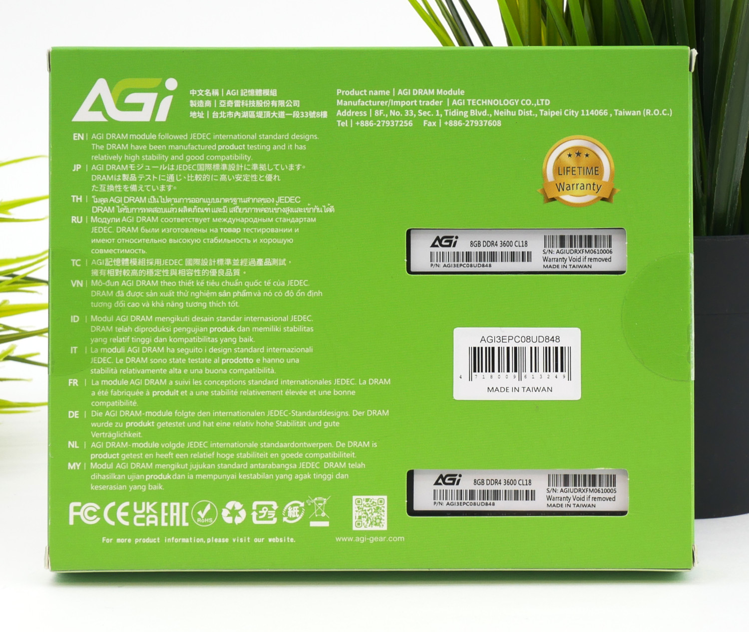 AGI TurboJet RGB DDR4-3600 2x8 Гбайт поставляется в черно-зеленой красочной упаковке. По внешнему виду уже можно оценить дизайн продукта, а его характеристики целиком указаны на коробке.