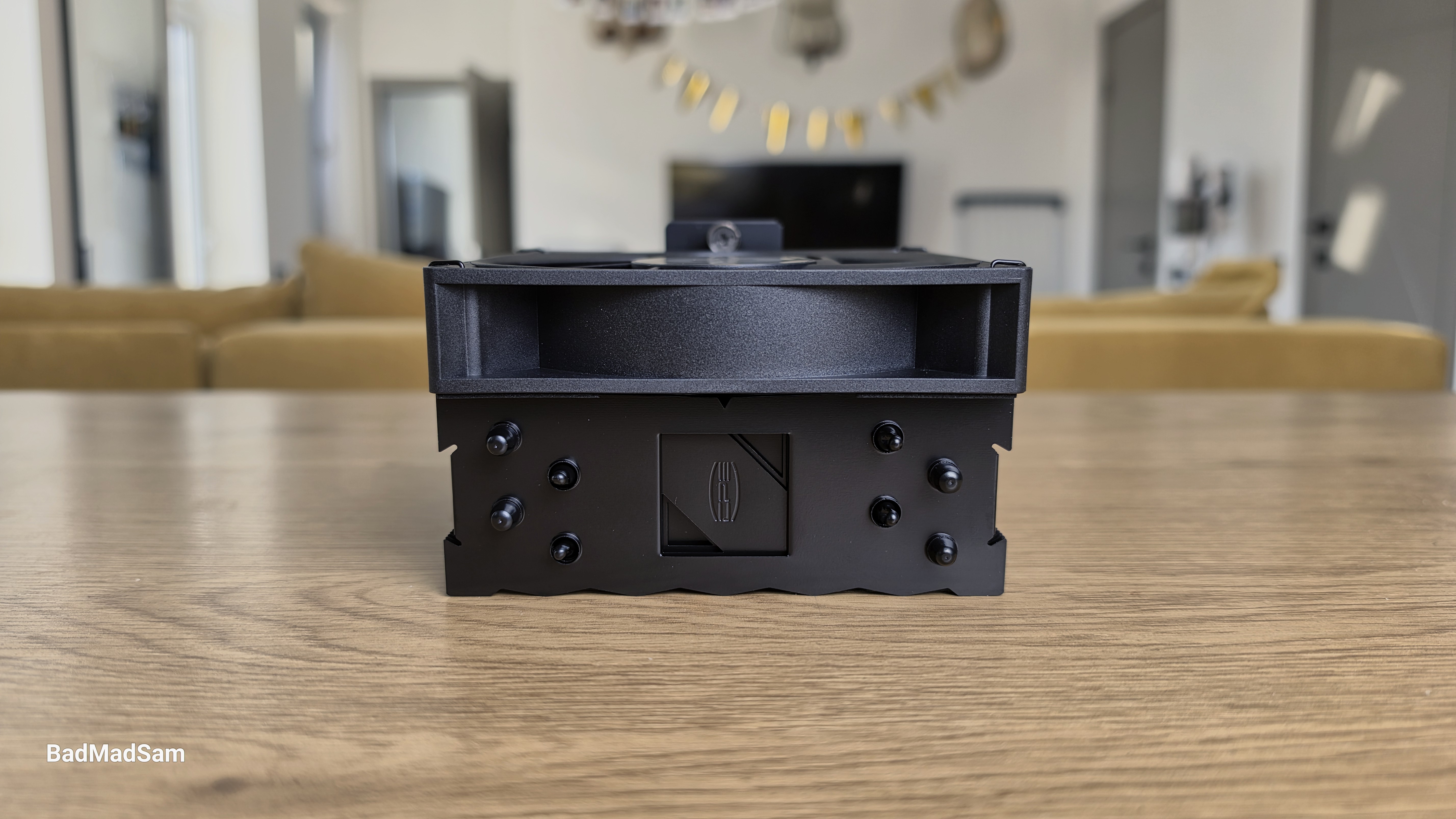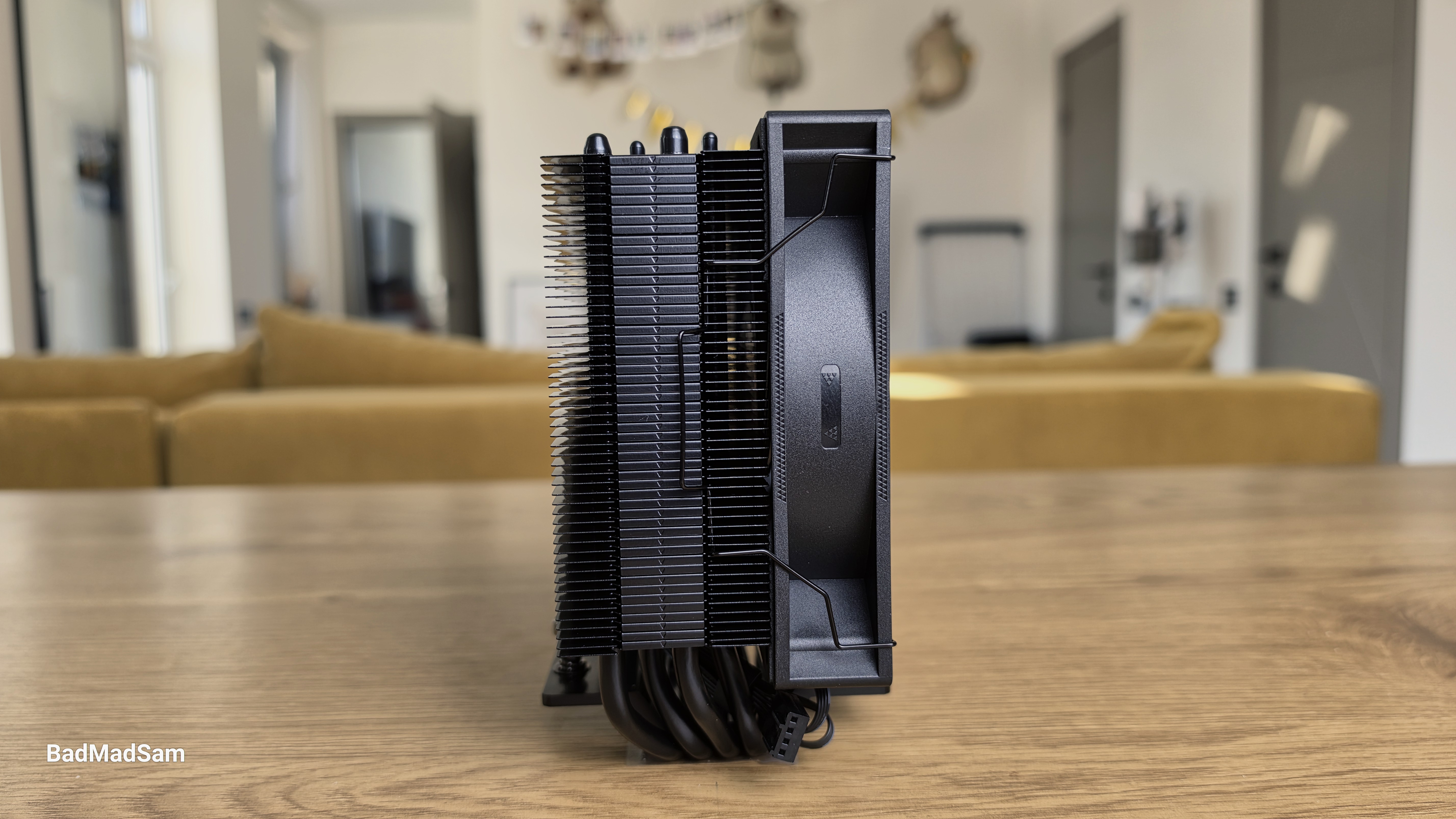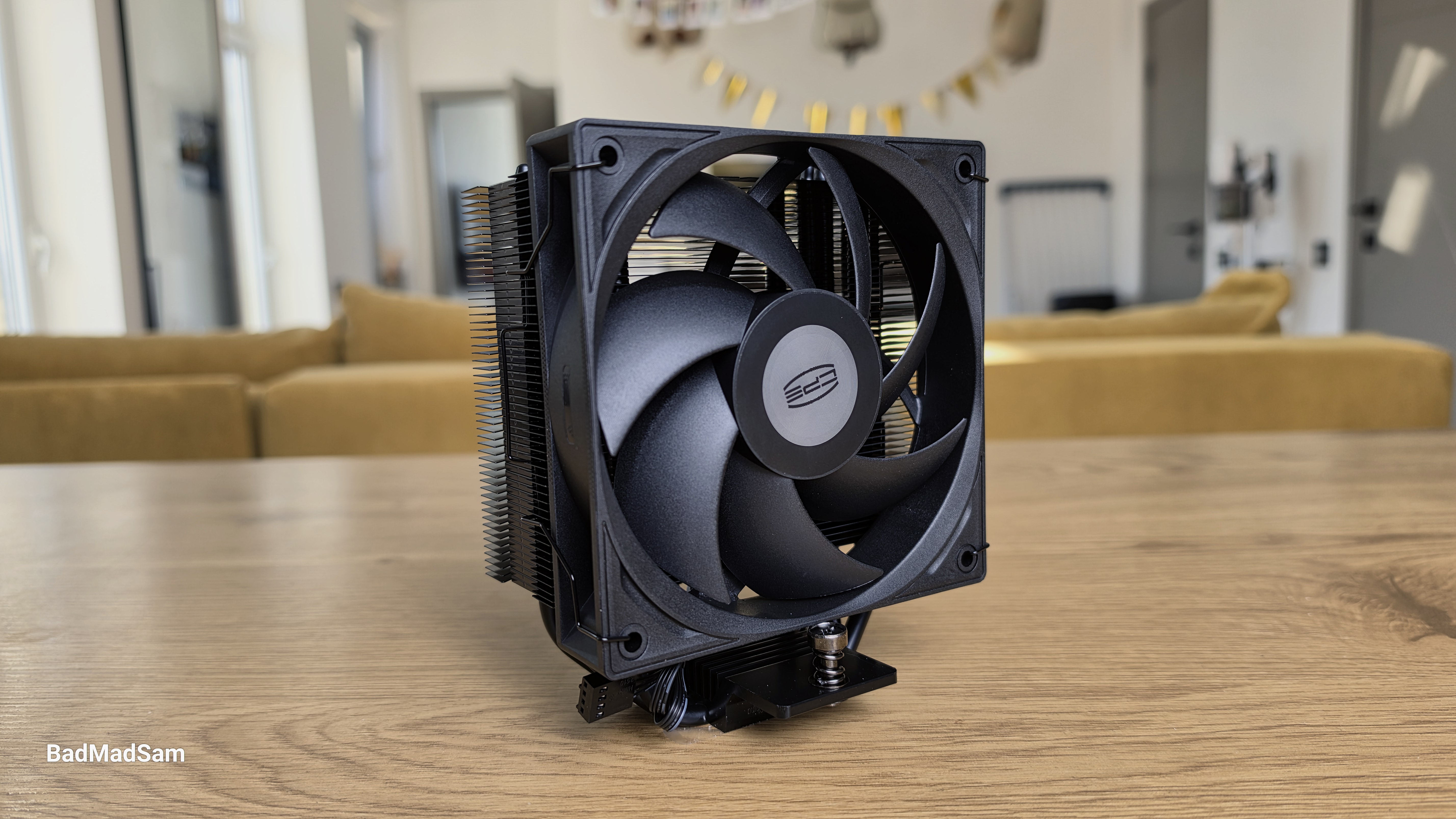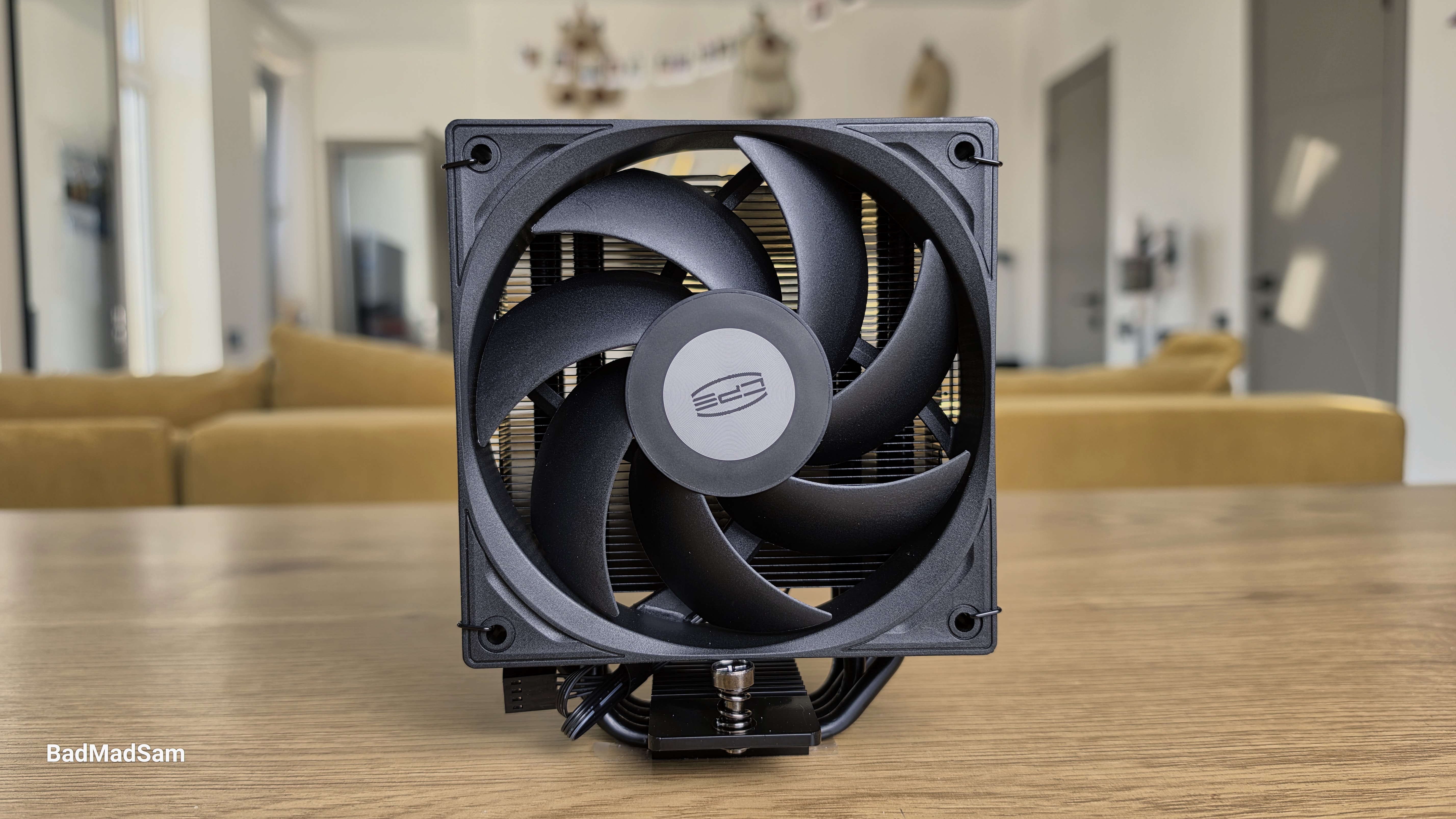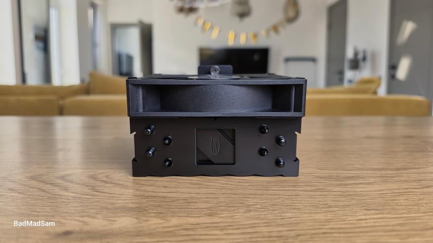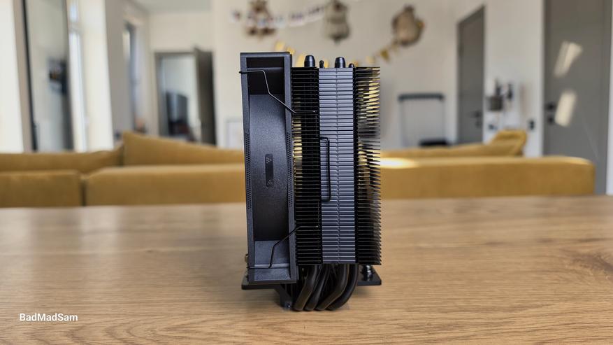 Вентилятор установлен на металлических скобах. Используется стандартная рамка 120x120x25 мм. Крыльчатка состоит из семи широких лопастей с выраженным изгибом, центральная часть закрыта круглой заглушкой с логотипом. Вентилятор расположен с небольшим смещением относительно радиатора. Основная масса башни отведена назад, за счет чего передняя часть не перекрывает зону оперативной памяти. По общей геометрии кулер остается узким и не выходит за габариты стандартной 120-мм рамки.