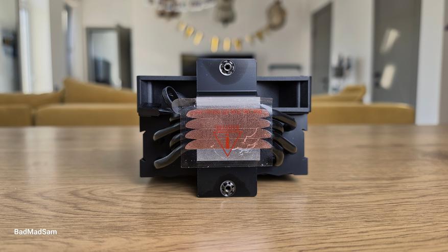Сверху радиатор закрыт металлической крышкой. По центру расположен логотип. Через крышку выведены окончания четырех тепловых трубок. Это отдельные наконечники с заглушками. Сами тепловые трубки окрашены в черный цвет и собраны плотным пучком. Они идут параллельно, без сильного разброса по ширине радиатора. В нижней части трубки сгибаются и заходят в основание.