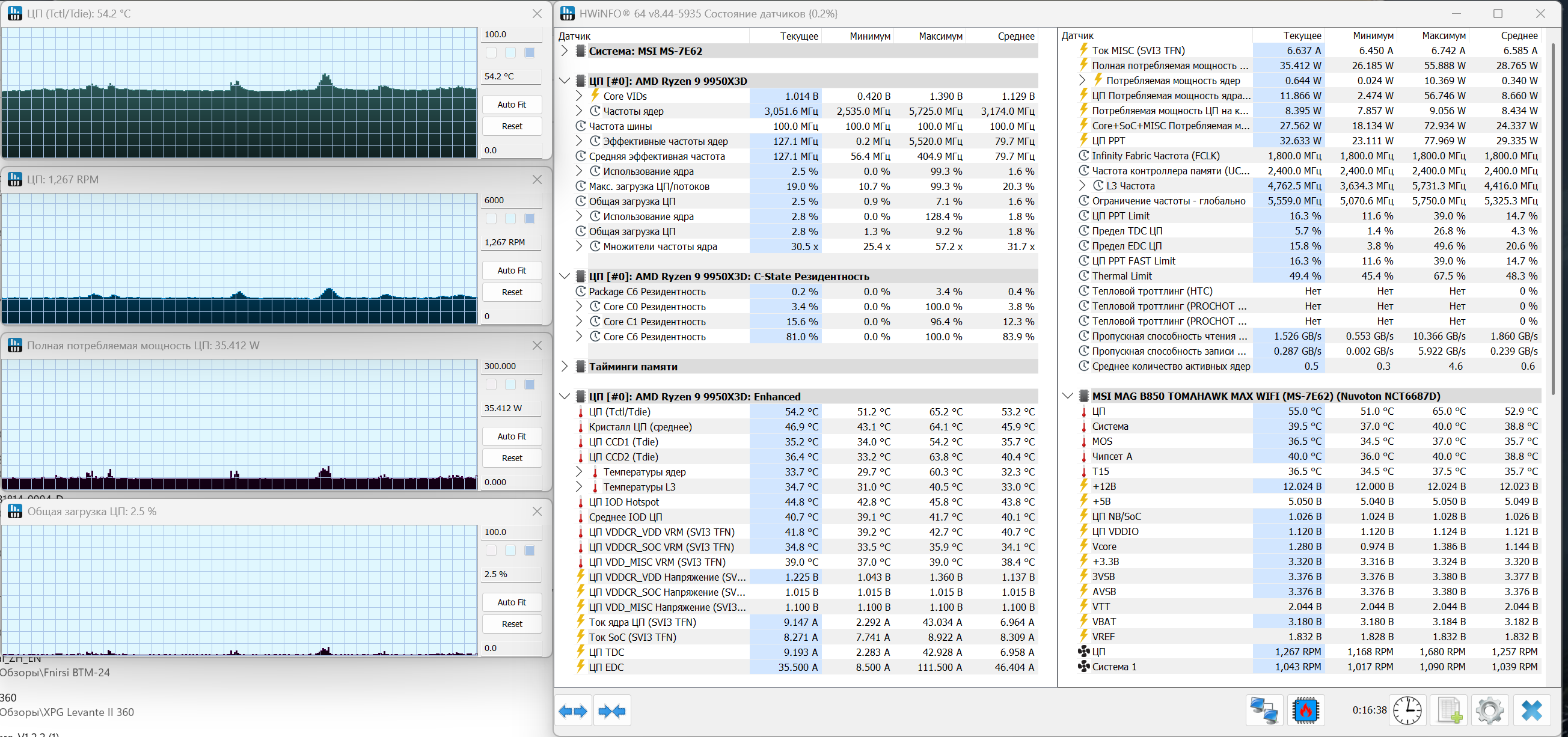 Вполне ожидаемо, в простое система ведет себя спокойно. Температура процессора держится на уровне около 54 °C, без резких скачков, график ровный с небольшими колебаниями. Потребление в среднем составляет порядка 35 Вт, при этом загрузка процессора минимальная, около 2-3%. Вентилятор работает на уровне около 1260 об/мин, без заметных изменений по ходу теста. В таком режиме кулер не нагружается, но уже видно, что он не уходит в совсем низкие обороты и держит стабильный базовый уровень охлаждения.