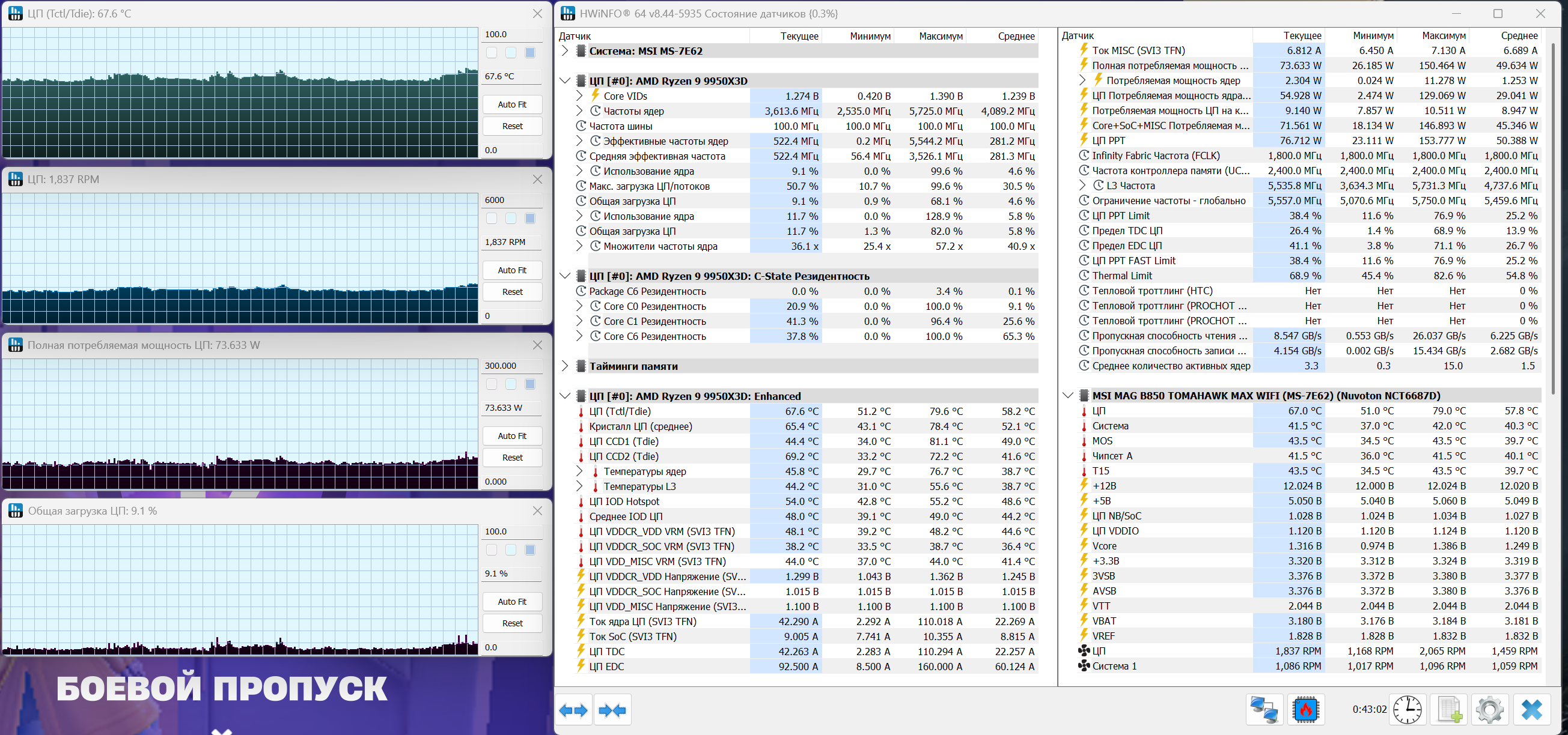 При запуске Fortnite на минимальных настройках с использованием встроенной графики нагрузка возрастает умеренно. Температура поднимается до ~67 °C, при этом максимум фиксируется в районе 79 °C. Среднее значение держится ближе к 58 °C. Потребление увеличивается до 73 Вт, что хорошо отражает переход от простоя к реальной, но не максимальной нагрузке. Вентилятор выходит на обороты в районе 1800 об/мин и уже работает заметно активнее, но без резких скачков — обороты растут плавно и удерживаются на одном уровне.