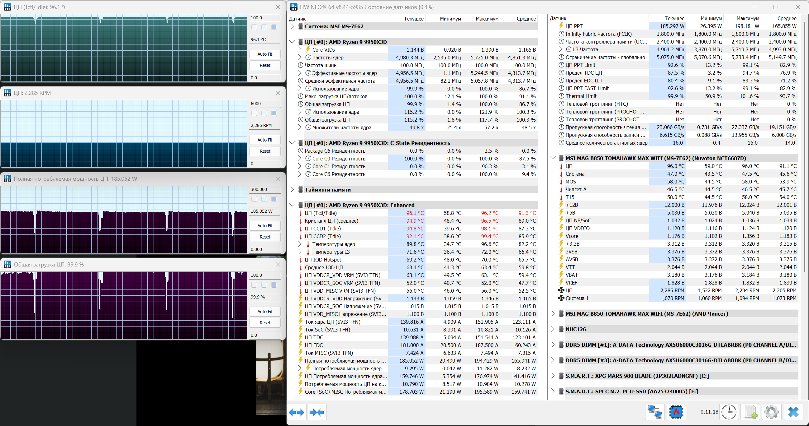 В Cinebench 2026 кулер работает в условиях полной нагрузки. Загрузка процессора достигает 100%, энергопотребление поднимается до 185 Вт. Температура выходит на уровень 96 °C и держится близко к этому значению на протяжении всего теста, с минимальными просадками. По отдельным датчикам видно, что значения близки к пределу, что ожидаемо для такого уровня мощности. Вентилятор раскручивается до 2280 об/мин, фактически достигая своего максимума. При этом график температуры остается стабильным, без резких скачков, что говорит о том, что кулер удерживает нагрузку, но работает уже на пределе своих возможностей.