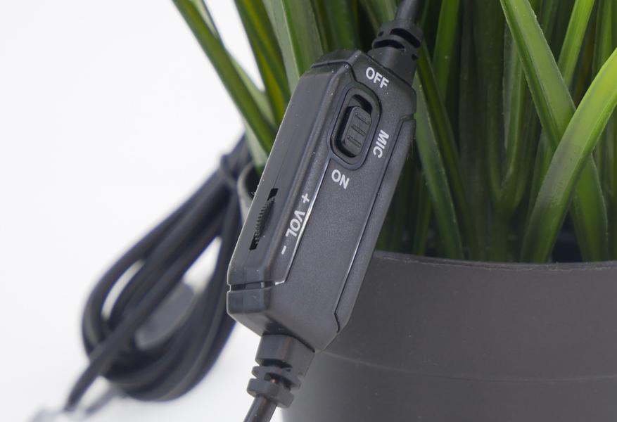 На проводе висит пульт управления гарнитурой Rapoo H150S. Есть переключатель микрофона, хотя надпись ON читалась для меня как NO, поэтому я вначале глядел на «No» и «Off» и не мог понять, где здесь правильное положение для включения микрофона. Потом дошло. И колесико громкости.