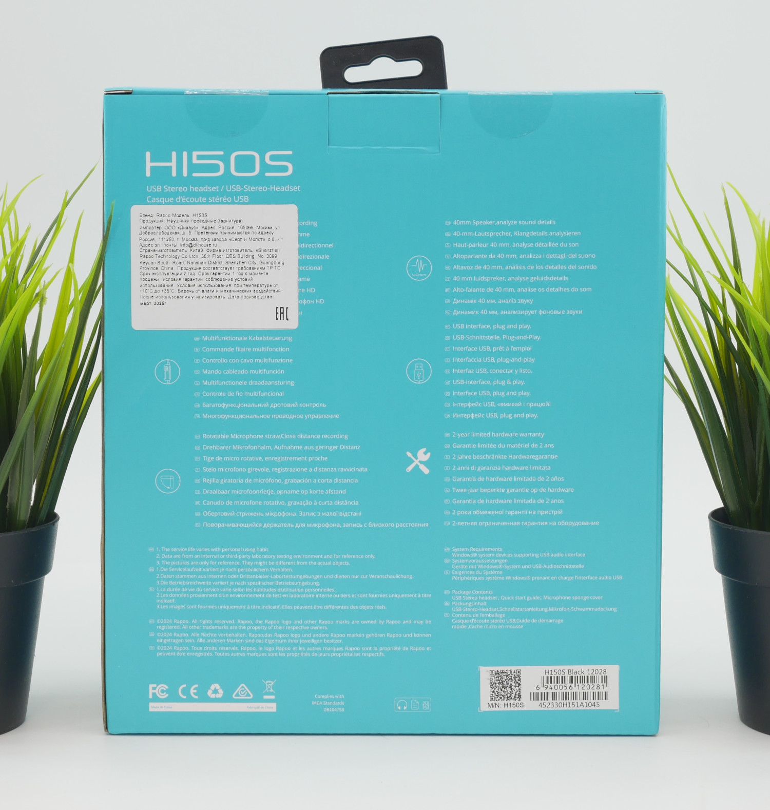 После приобретения проводной гарнитуры Rapoo H150S на стойке выдачи вы получите легкую и небольшую по размерам коробку с голубым оформлением и фотографией периферии. Выглядит она презентабельно на упаковке. С обратной стороны имеется описание ключевых характеристик: Rapoo H150S оснащена драйверами 40 мм и микрофоном с шумоподавлением. Информация на наклейке гласит, что данный экземпляр сделан в марте 2025 года.