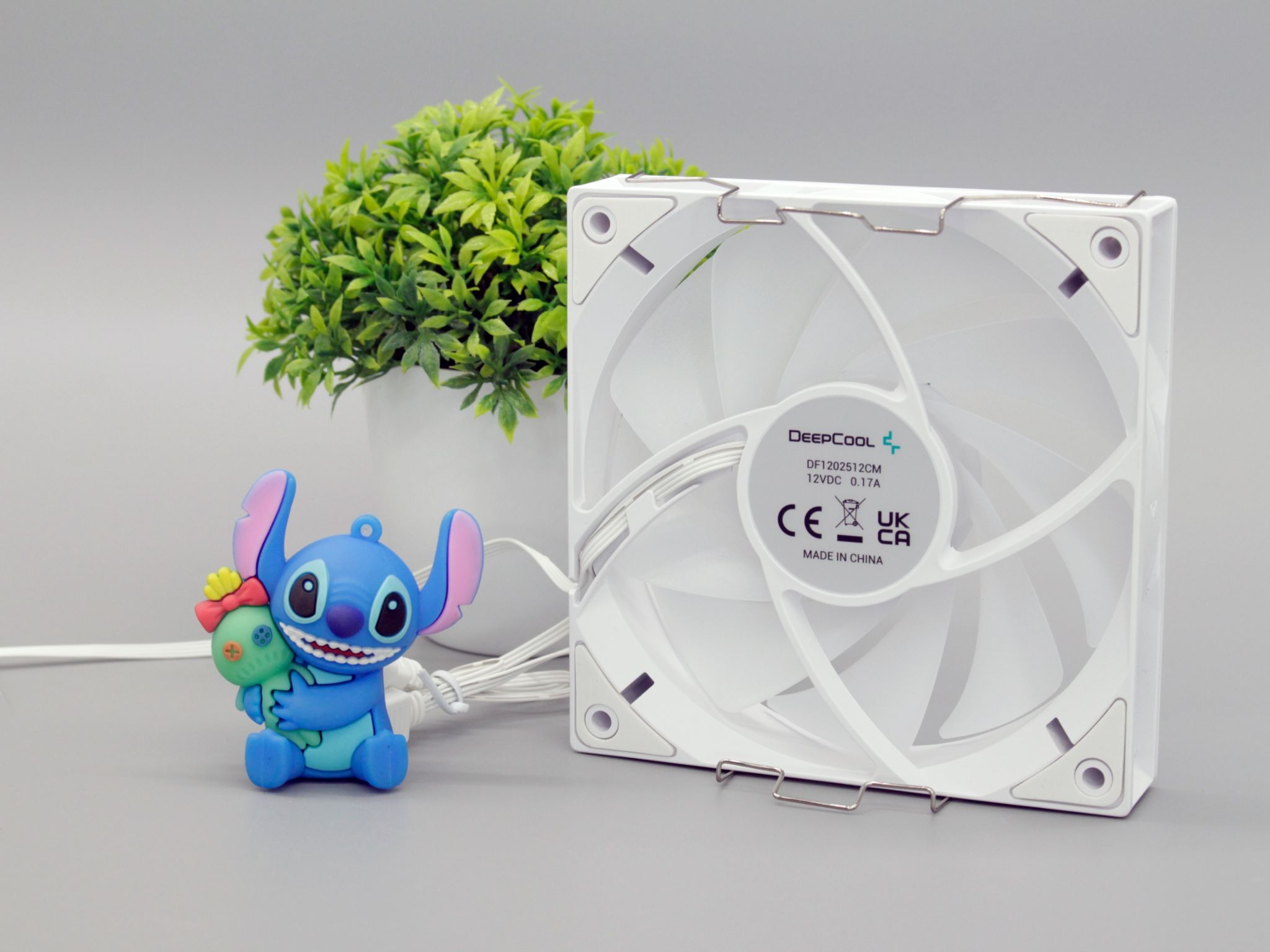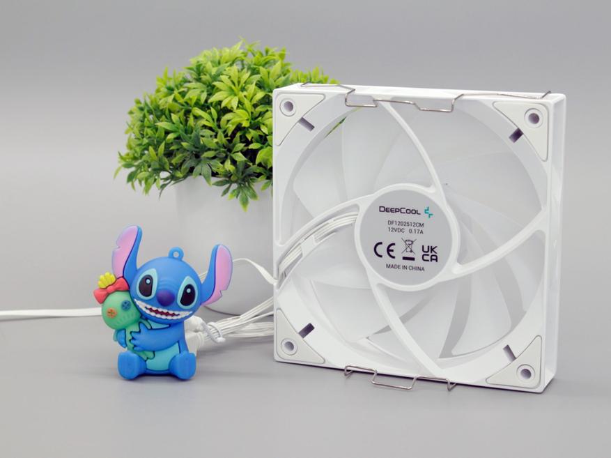 Наклейка брендированная DeepCool с указанием характеристики и модели: DF1202512CM 12VDC 0.17A. Крыльчатка вентилятора на 9 лопастей, а на углах корпуса находятся вибропоглощающие резинки. Для крепления используются стандартные пружины.