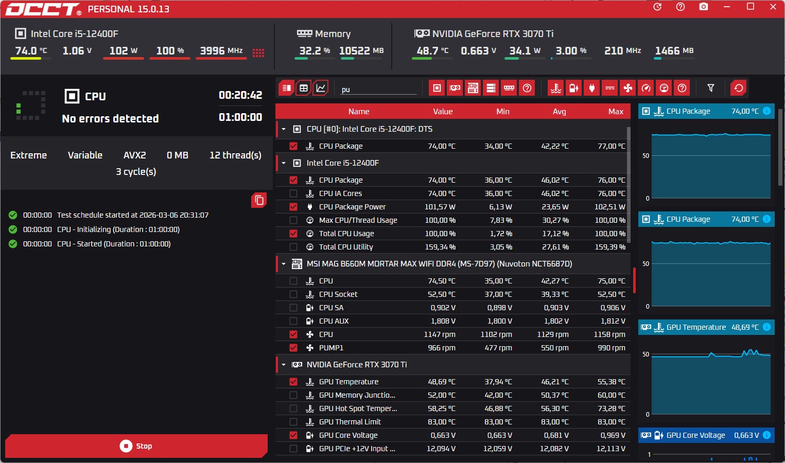 Тест OCCT очень сильно грузит систему и поднимает температуру ЦП до 78 градусов в пике, при этом AG400 WH ARGB V2 уже разгоняется до своего максимума в ~2500 об/мин.