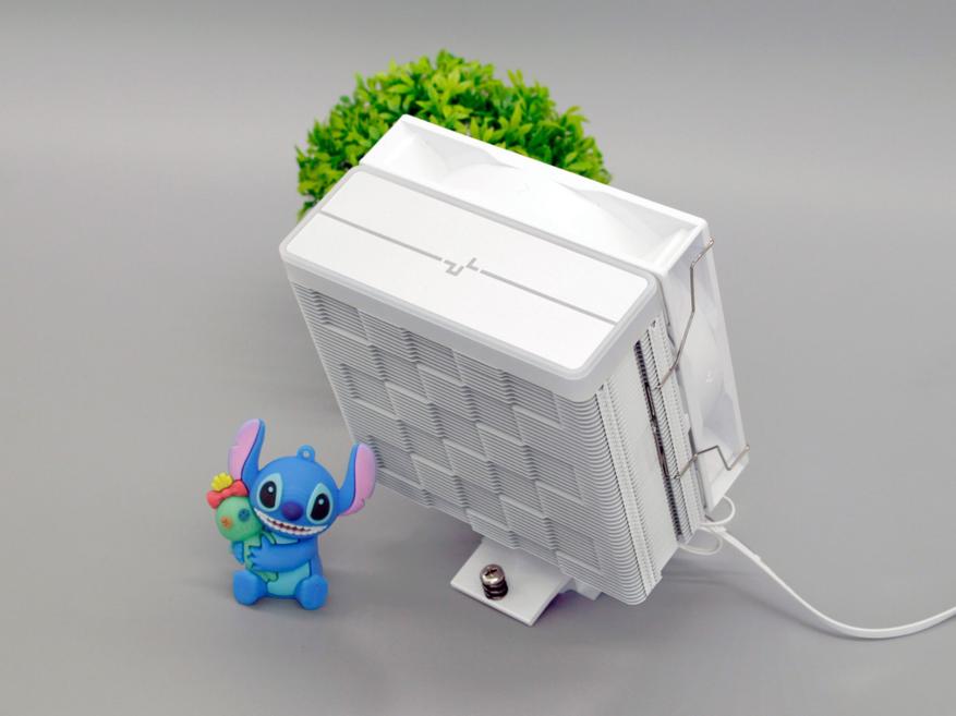 Верхняя часть радиатора прикрыта декоративной вставкой из пластика, который имитирует анодированный алюминий. По периметру накладки находится матовый светопроводящий пластик, а в средней части сформирован логотип компании DeepCool.